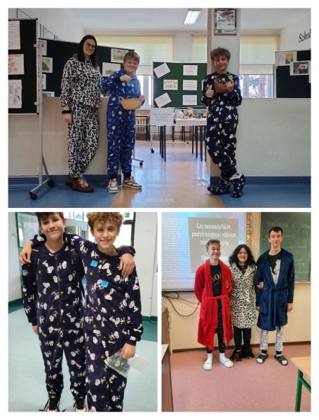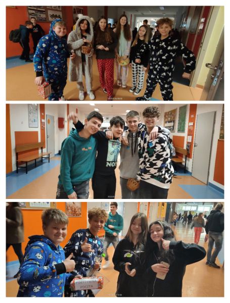 - W poniedziałek 16.01.2023 - uczniowie przebrali się w pluszowe piżamy i losowali naklejki „przytul mnie”.