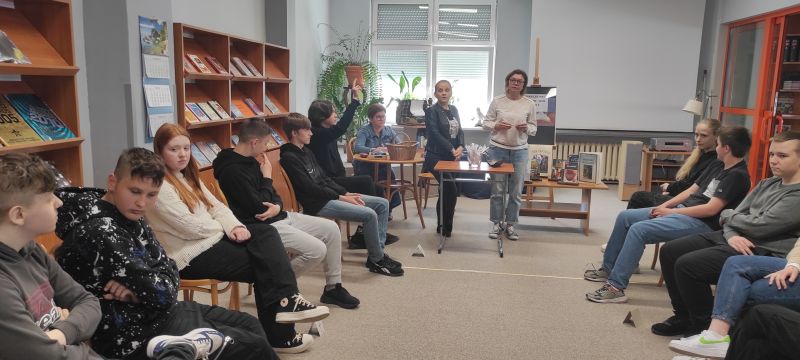 W maju zaprosiłyśmy do biblioteki szkolnej wszystkich uczniów klas 8. Wspólnie przypominaliśmy bohaterów literackich i wydarzenia z lektur, a także analizowaliśmy motywy literackie.