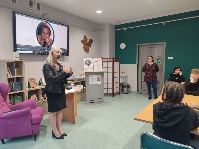 Rok 2024 ustanowiono Rokiem Czesława Miłosza, polskiego poety i Noblisty. Klas 7a i 7d zostały zaproszone do Biblioteki Miejskiej na warsztaty biograficzno-literackie: „JEST TAKA CIERPIENIA GRANICA, ZA KTÓRĄ SIĘ UŚMIECH POGODNY ZACZYNA”. Głównym ich celem było upowszechnianie wiedzy o życiu i twórczości Czesława Miłosza oraz przybliżanie jego dzieł. Prowadząca Monika Sawicka-Kacprzak (pisarka, dziennikarka, w naszej bibliotece znajdują się jej powieści „Kruchość porcelany, „Serwantka” oraz „Demi-sec”) wskazała zarówno tło historyczne dzieł Noblisty, jak i ich ciągle aktualne przesłanie.