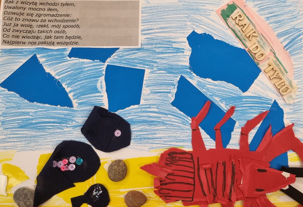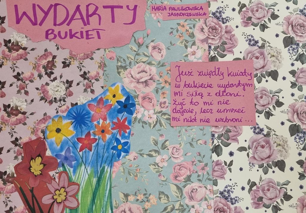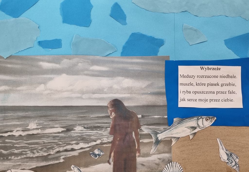 W bibliotece uczniowie przeczytali wiele wierszy poetki i podjęli próbę ich interpretacji. Wysłuchali również piosenki Sanah „Pocałunki”, której tekst oparty jest na utworach z tomiku o tym samym tytule. Następnie sami układali wiersze i nadawali im tytuły. Na lekcjach plastyki każdy uczeń wykonał kolaż do wybranego przez siebie wiersza. Prezentujemy kilka z nich.