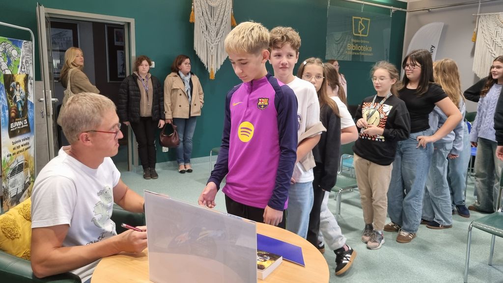 23 września, w Bibliotece Miejskiej, odbyło się spotkanie z pisarzem - Pawłem Gołuchem. Z wykształcenia programista, z zamiłowania pisarz, a zawodowo ratuje stare meble w odziedziczonym zakładzie tapicerskim – Paweł Gołuch - spotkał się z uczniami klasy 6b i opowiedział o swojej pierwszej powieści science fiction „Elwin 13.400 lat po Upadku”. Akcja toczy się w dwóch światach... W jednym z nich, na wrocławskim osiedlu uprowadzona zostaje 14-letnia Julia i ślad po niej ginie. Szkolny kolega Daniel mógłby pomóc w jej odnalezieniu, gdyby tylko uważniej obserwował, co dzieje się na ulicy, a nie wpatrywał się w telefon. W drugim świecie Elwin, lat 13, zostaje zahibernowany i wysłany w przestrzeń, aby przeczekać deszcz meteorytów. Pewnego dnia kapsuła ląduje, Elwin budzi się i widzi, że życie się toczy… Brakuje wody, ludzie chowają się w bastionach, po ziemi chodzą wielkie mrówki. Można odbudować ziemię, bo gdzieś na świecie ukryty jest bank nasion i komórek, i chłopak zna to miejsce, ale jego pamięć jest zablokowana. Co łączy Daniela i Elwina? Czy wygrają wyścig z czasem? Czy przypomną sobie istotne dla życia fakty? Paweł Gołuch w obrazowy sposób pokazał, jak łatwo oszukać nasz mózg. Nie zawsze to, co widzimy, jest prawdą. Wskazał też, jak skupić się na tym, co najważniejsze, jak dostrzegać istotne szczegóły. Na koniec autor rozdał zakładki ze swoim autografem. Obejrzyjcie załączone zdjęcia i sprawdźcie, co potrafi wasz mózg...
