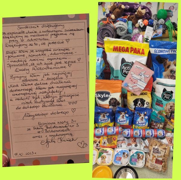 W tym miejscu pragnę gorąco PODZIĘKOWAĆ Rodzicom moich Uczniów za wsparcie zwierząt ze schroniska - zebrana ilość karm, zabawek, akcesoriów i kocy - przekroczyła moje najśmielsze oczekiwania! Wiadomo, że to tylko kropla w morzu potrzeb, jednak każdy gest się liczy...