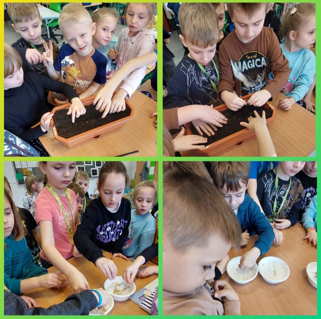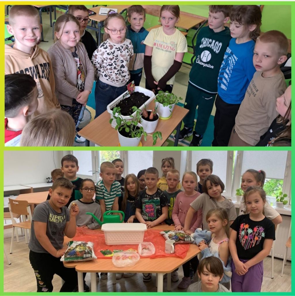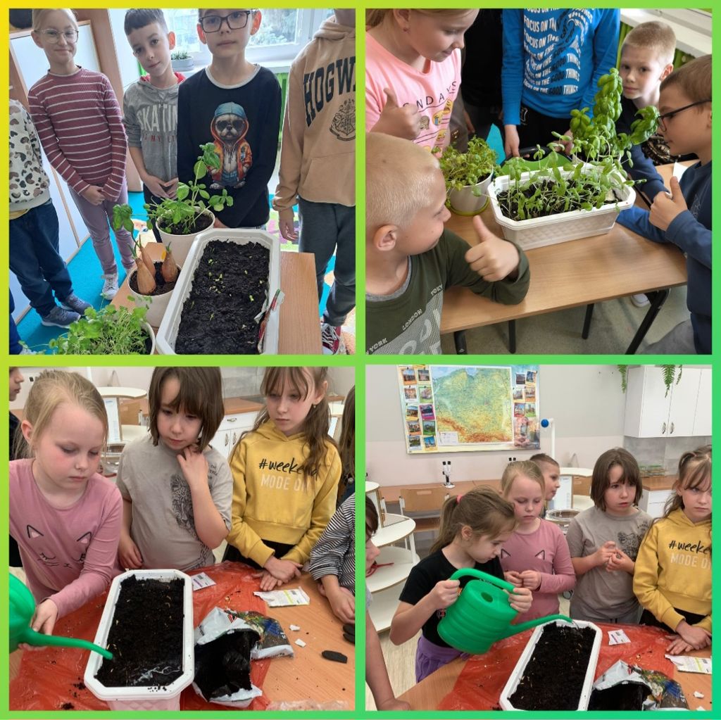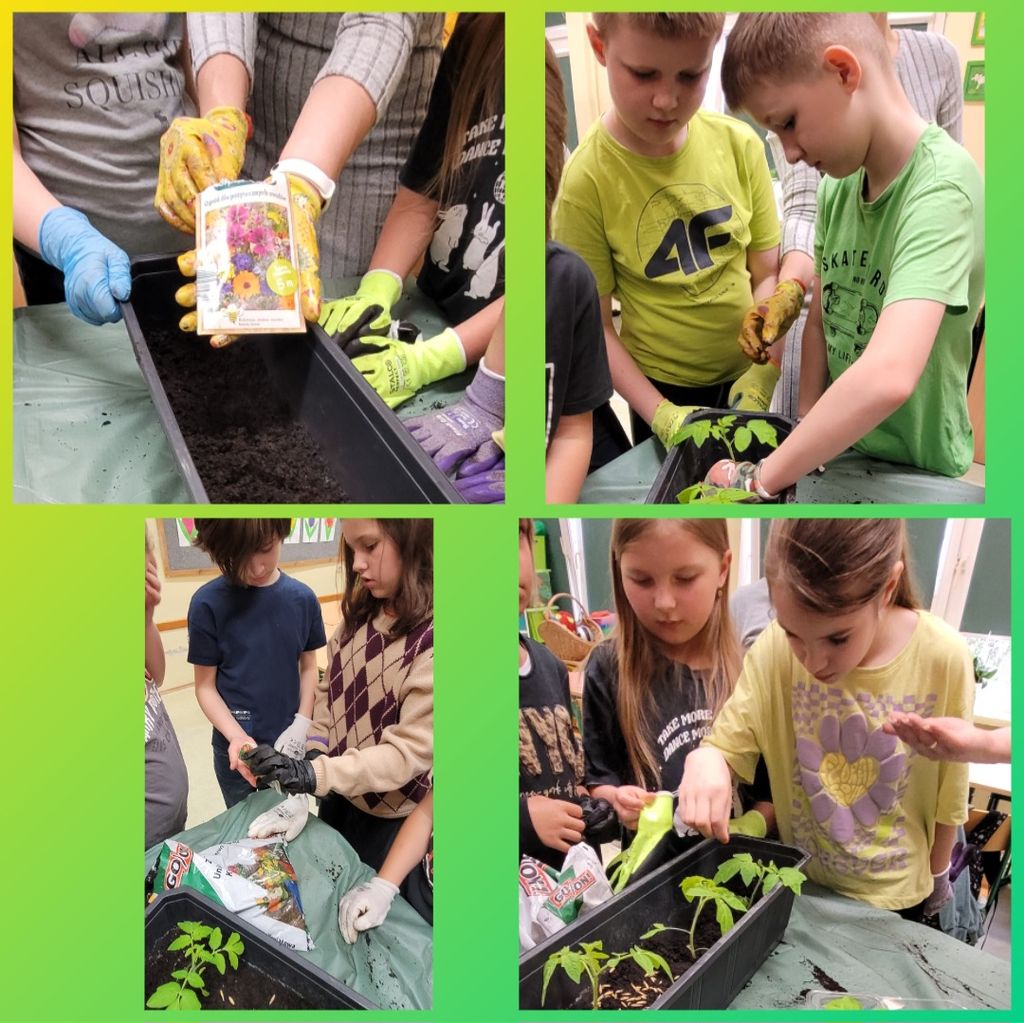 W kwietniu wszyscy uczniowie klas 1 - 3 zamienili się w ogrodników. Wspólnymi siłami posadzili przeróżne sadzonki oraz wysiali rozmaite nasionka. Teraz, z ogromną radością i wielkim zaangażowaniem, podlewają klasowe ogródki i obserwują wzrost roślinek.