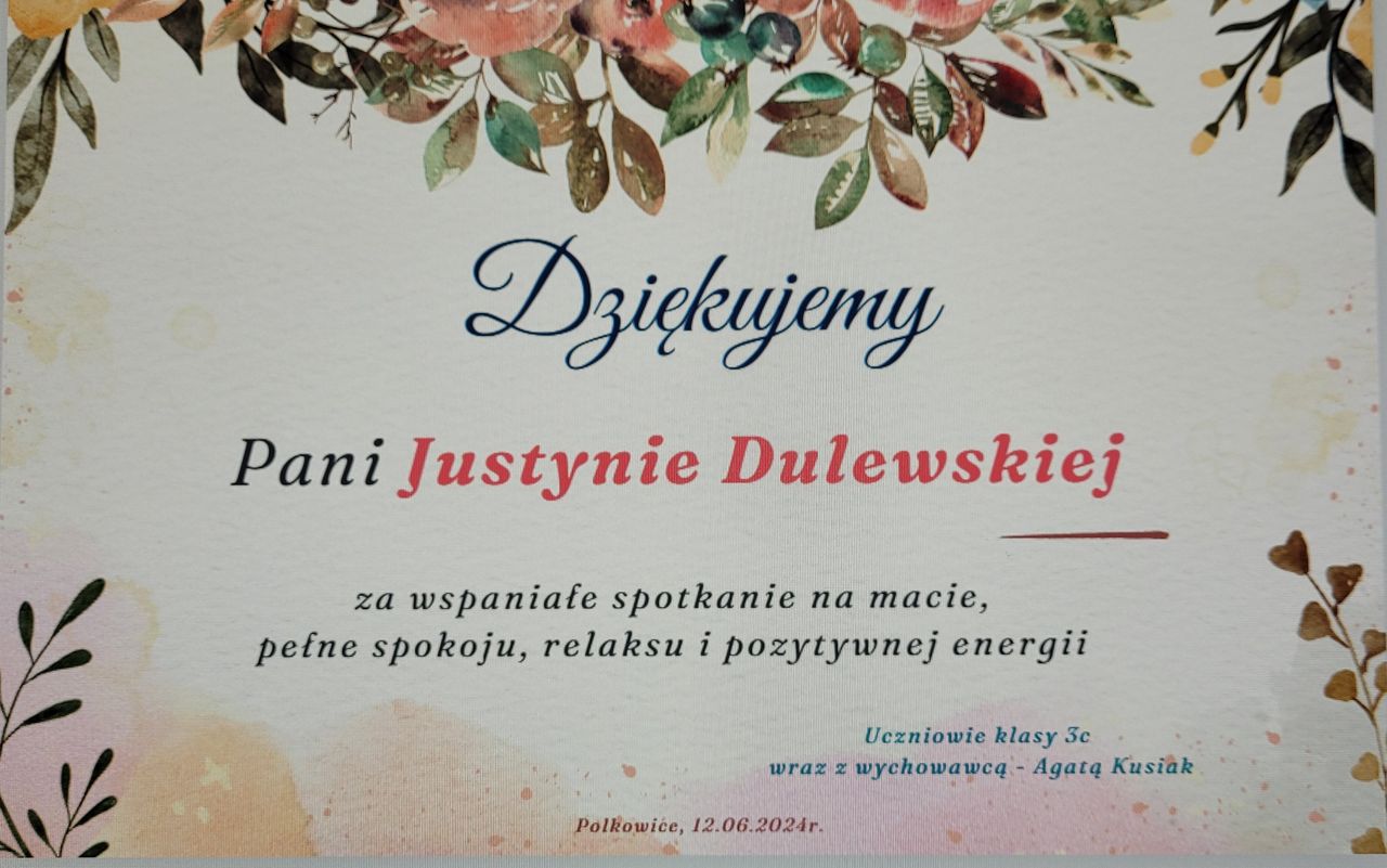 12 czerwca trzecioklasiści uczestniczyli w zajęciach jogi, przeprowadzonych przez, zaproszoną na tę okazję, nauczycielkę jogi – Panią Justynę Dulewską z Good Day Yoga Polkowice. Zajęcia polegały na wykonywaniu ćwiczeń rozciągających i rozluźniających oraz doskonalących uważność. Przebiegały przy spokojnej muzyce, były pełne spokoju, relaksu i pozytywnej energii. Uczniowie mieli doskonałą okazję, aby się wyciszyć i w pełni skoncentrować. Serdecznie dziękujemy Pani Justynie za przyjęcie zaproszenia i przeprowadzenie wspaniałych, wręcz magicznych zajęć.