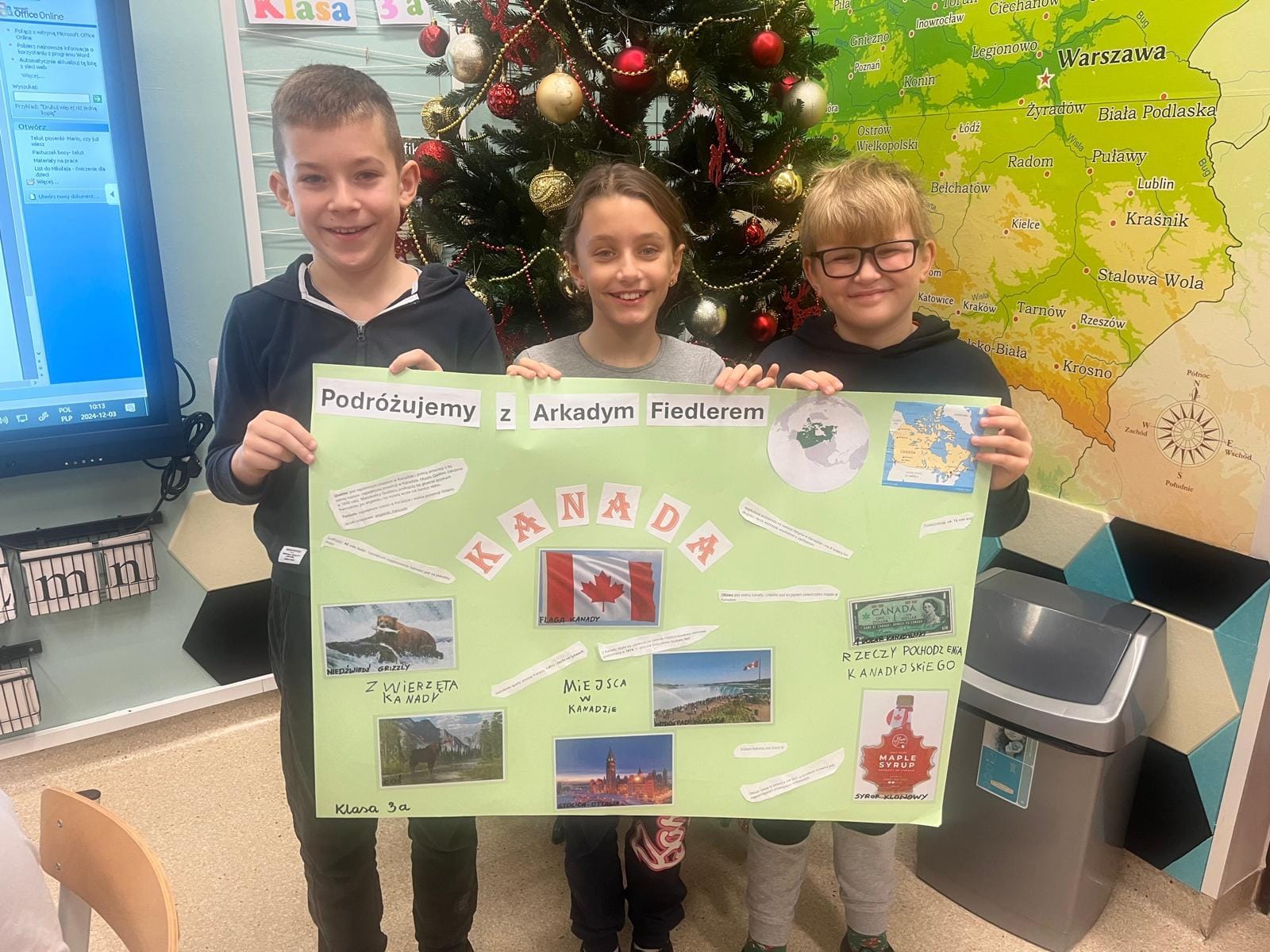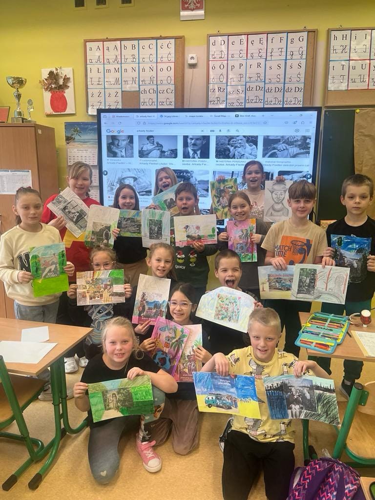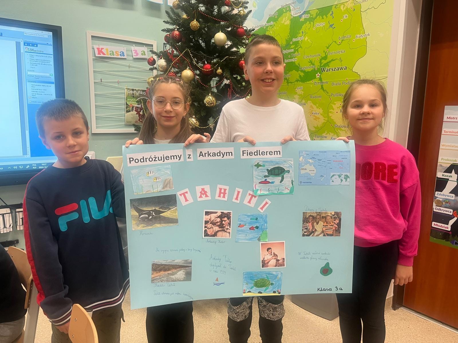 Na przełomie listopada i grudnia uczniowie klas trzecich realizowali projekt „Podróżujemy z Arkady Fiedlerem”. Dzieci poszukiwały i gromadziły informacje na temat patrona naszej szkoły, jego podróży oraz twórczości literackiej. Efektem wytężonej pracy uczniów są prezentacje multimedialne o Arkadym Fiedlerze oraz plakaty prezentujące wybrane miejsca, które odwiedził nasz patron.