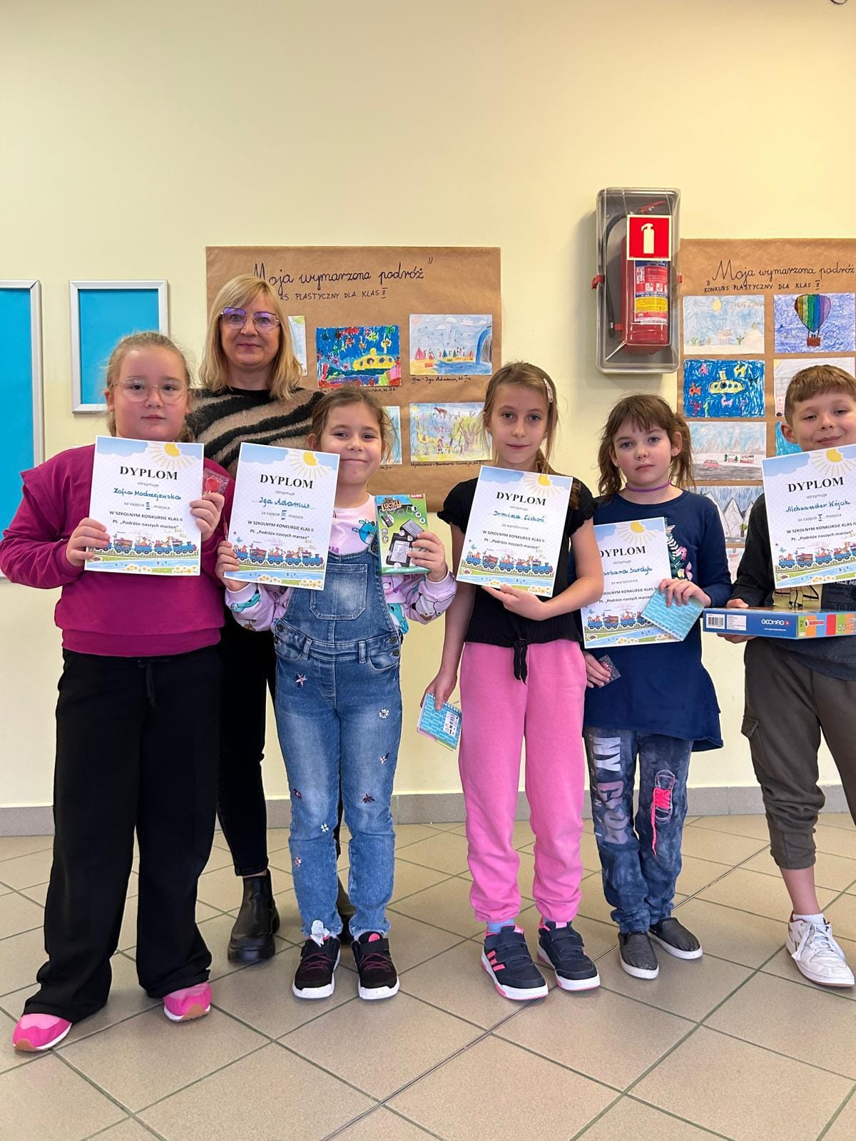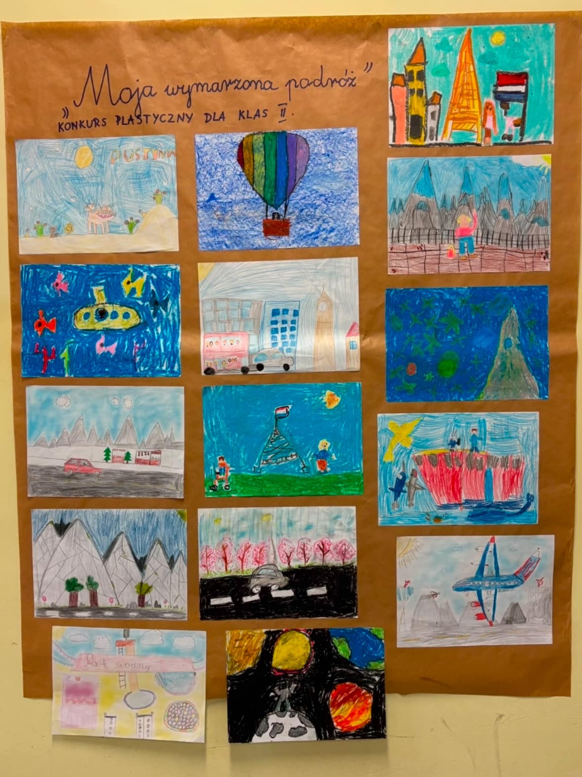 Na początku grudnia odbył się konkurs plastyczny dla uczniów klas drugich p.n. „Moja wymarzona podróż". Uczestnicy konkursu w swoich pracach pokazali, że marzą o podróżach w bliskie i dalekie części świata, o podróżach podniebnych i w głębiny oceanu, a także na inne planety. Jury miało trudne zadanie w wyborze najciekawszych prac, bo mali artyści wykazali się dużą pomysłowością. Po długich debatach nagrodzono sześcioro dzieci:
