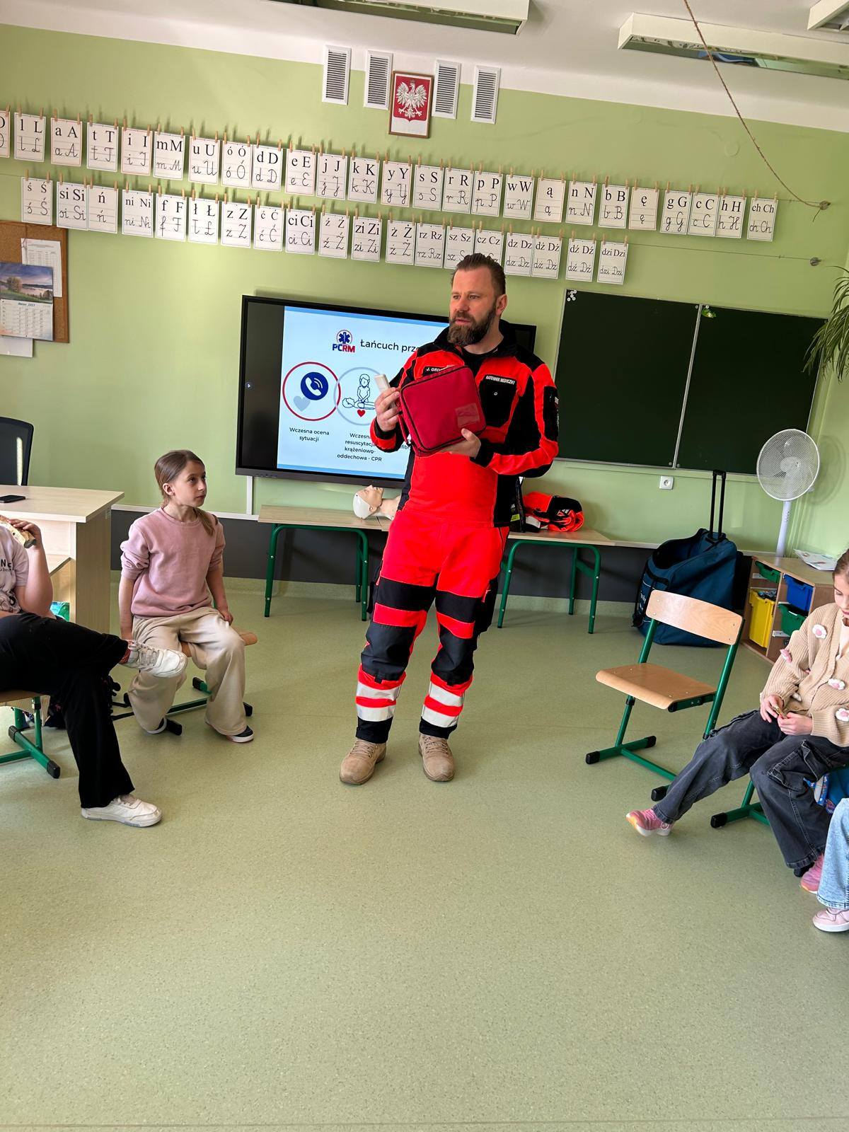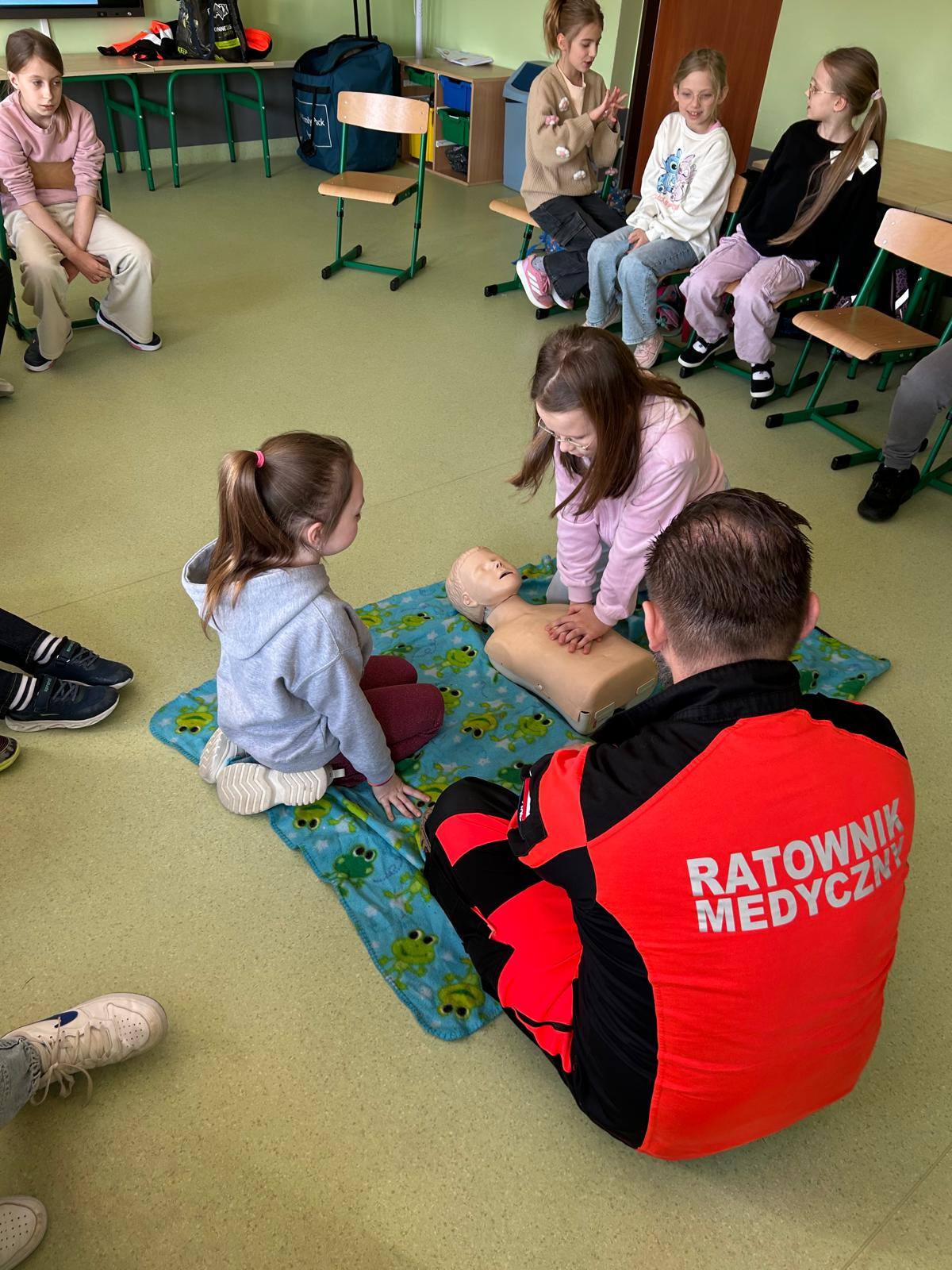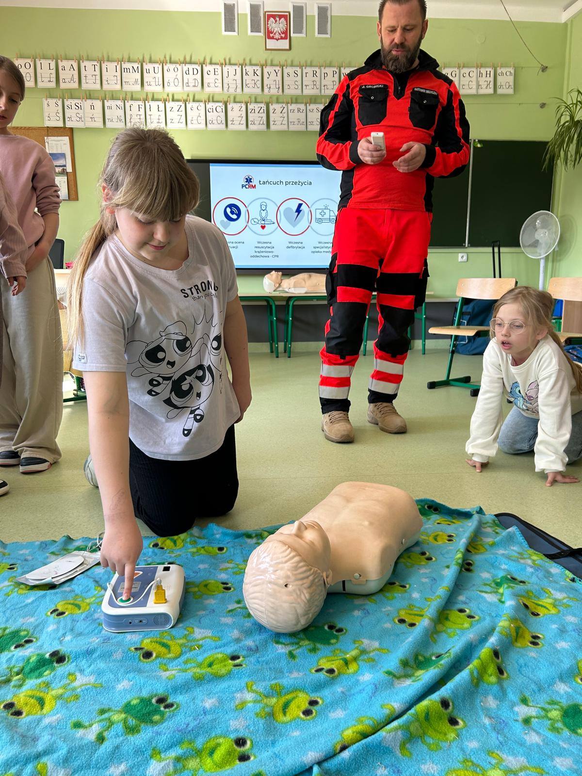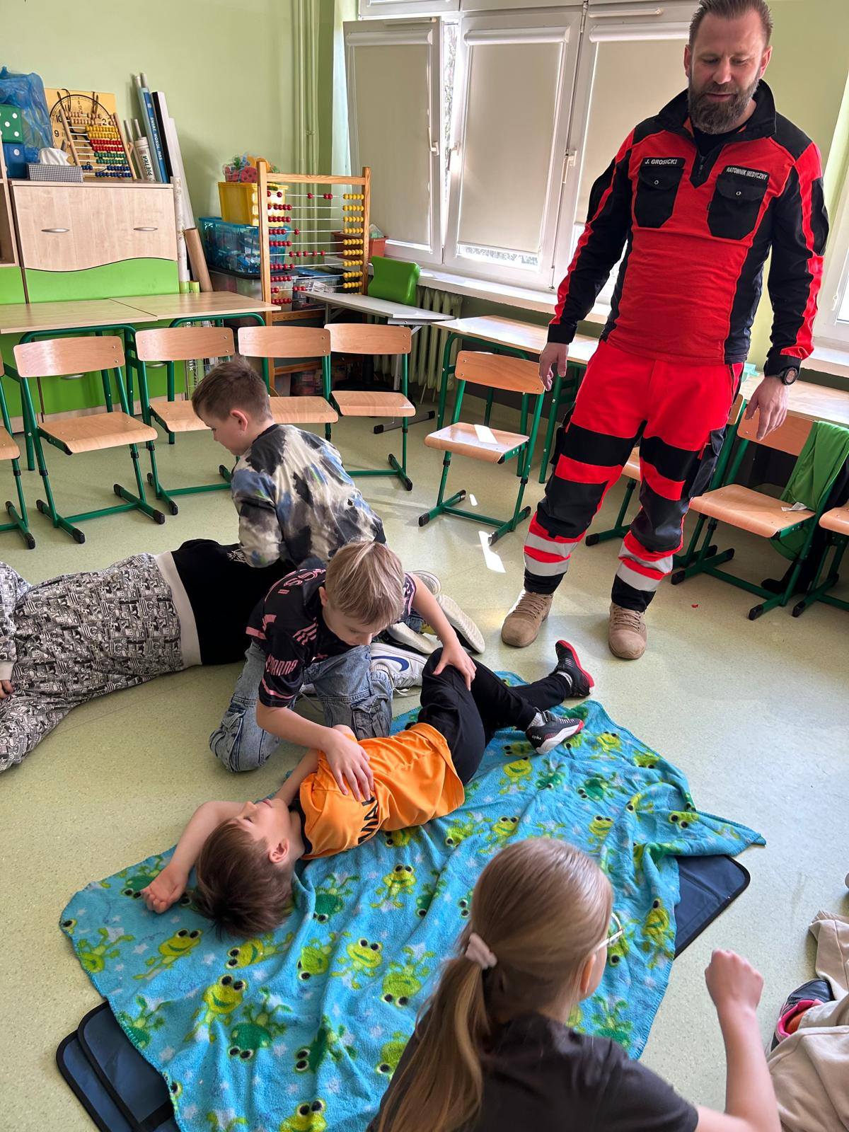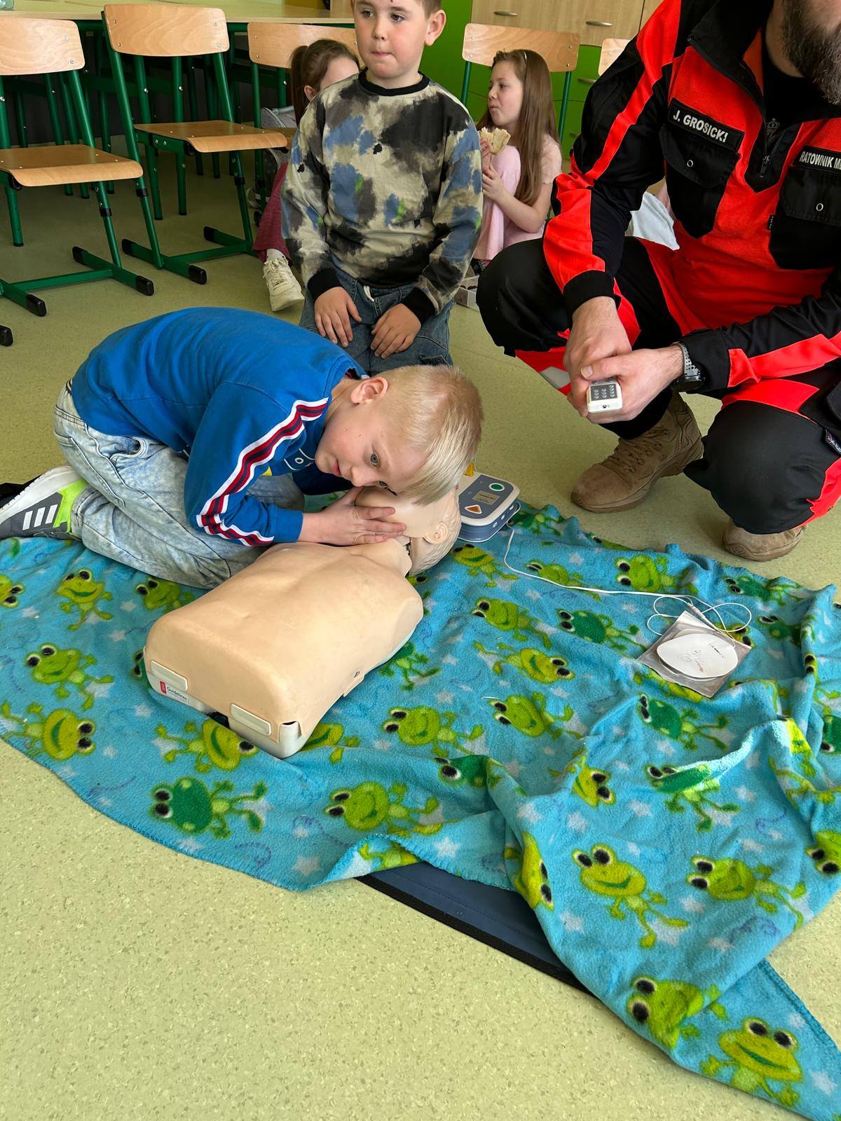 28 marca uczniowie klasy 2b gościli na lekcjach pana Jakuba Grosickiego - ratownika medycznego z Polkowickiego Pogotowia Ratunkowego. Pan ratownik przeprowadził dla uczniów zajęcia z udzielania pierwszej pomocy przedmedycznej. Dzieci ćwiczyły, jak prawidłowo wezwać pomoc pod numerem 112 lub 999. Na fantomie trenowały jeden z elementów resuscytacji - uciski klatki piersiowej. Pod okiem pana ratownika ćwiczyli też ułożenie poszkodowanego w tzw. pozycji bezpiecznej oraz jak prawidłowego użycia defibrylatora AED. Przeprowadzone zajęcia bardzo zainteresowały drugoklasistów. Dzięki nim zdobyli cenne, praktyczne umiejętności. Uczniowie, wraz z wychowawcą, panią Moniką Mitką, dziękują panu Jakubowi Grosickiemu za przyjęcie zaproszenia na lekcje i przeprowadzenie ciekawych, praktycznych zajęć.