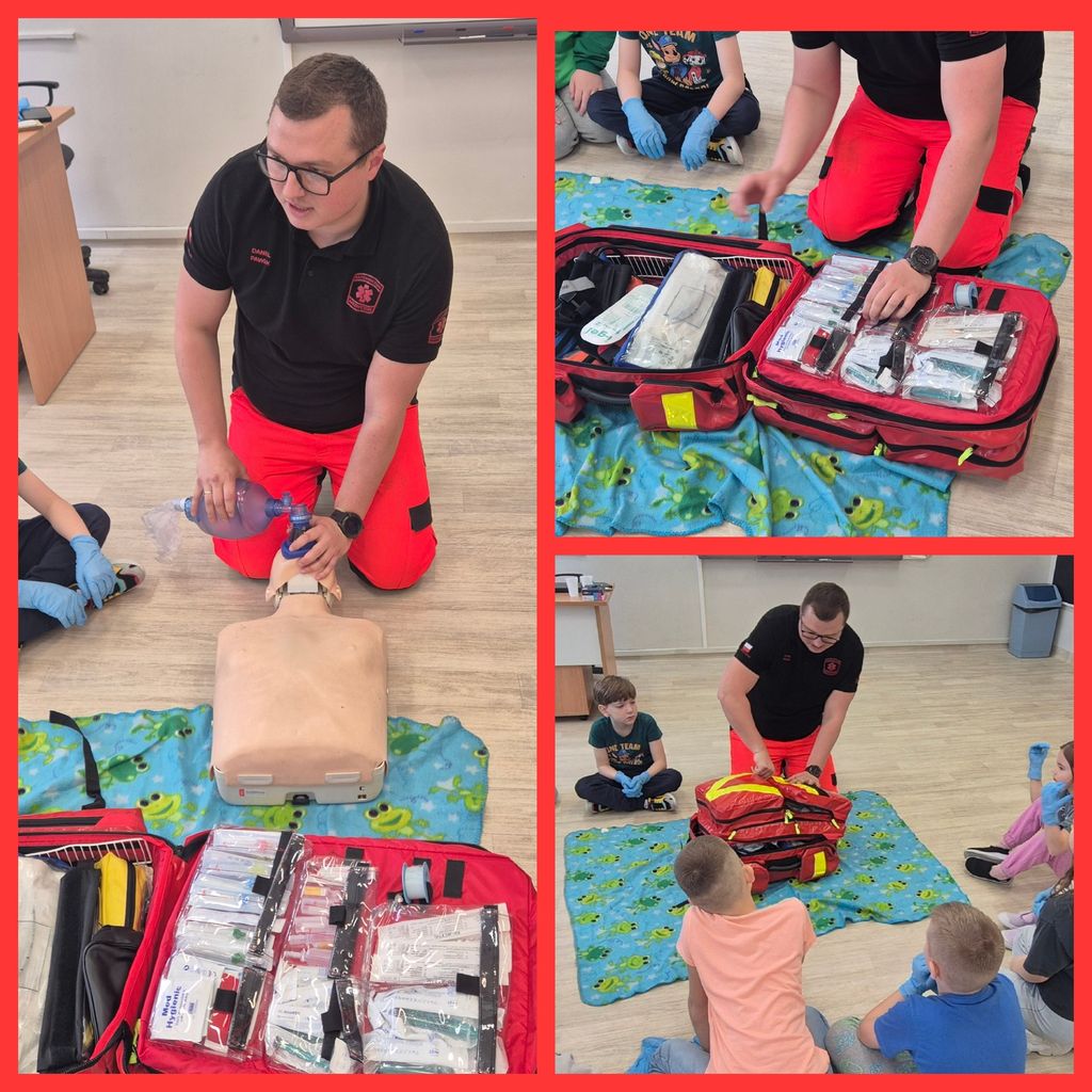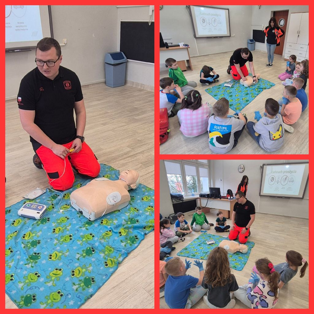 31 marca uczniowie klasy 1b gościli na lekcjach Państwa Klaudię i Daniela Pawlik - ratowników medycznych z Polkowickiego Pogotowia Ratunkowego i SOR-u Głogowskiego Szpitala Powiatowego. Ratownicy przeprowadzili dla uczniów zajęcia z udzielania pierwszej pomocy przedmedycznej. Dzieci poznały Algorytm Pierwszej Pomocy oraz Łańcuch Przeżycia, a także przypomniały sobie oraz utrwaliły numery alarmowe 112 i 999. Na fantomie trenowały kolejność działań w przypadku konieczności udzielenia pierwszej pomocy oraz resuscytację, czyli uciski klatki piersiowej. Poznały także zastosowanie defibrylatora AED. Duże wrażenie zrobiła na dzieciach ogromna apteczka, czyli plecak ratunkowy i wszystkie znajdujące się w nim leki i sprzęty. Największą atrakcją okazał się aparat do badania EKG i możliwość zbadania się. Wszyscy ochoczo dali się podłączyć do kabelków i obserwowali, jak bije ich serce. Przeprowadzone zajęcia były niesamowicie interesujące, wzbudzające moc wielkich emocji, a przede wszystkim wypełnione ogromem niezbędnej wiedzy i umiejętności. Uczniowie, wraz z wychowawcą, panią Agatą Kusiak, dziękują Pani Klaudii i Panu Danielowi za wspaniale i owocnie spędzony czas. I za to, że ratują ludzkie zdrowie i życie!