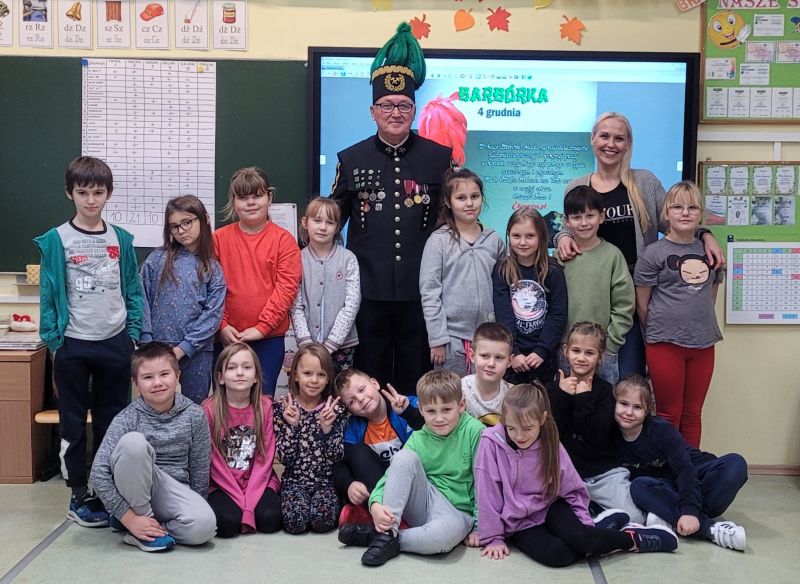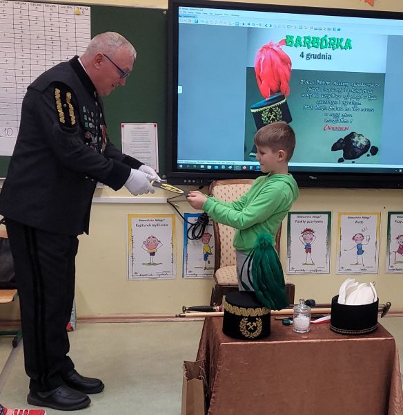 Grudzień to miesiąc Barbórkowy. Z tej okazji uczniów kilku klas odwiedzili górnicy z kopalni miedzi. Opowiedzieli o ciężkiej pracy górników, o tradycjach barbórkowych, o patronce górników - Świętej Barbarze, o górniczym mundurze galowym i o Skarbku, który strzeże podziemnych skarbów. Dzieci mogły zobaczyć górniczy kordzik i szpadę, a także górnicze medale i odznaczenia. Dowiedziały się również, jakie kolory piór może mieć górnicze czako i co dany kolor oznacza, jak również, że w naszych kopalniach, oprócz rudy miedzi, wydobywana jest także sól kamienna. Każdy dostał w prezencie po kilka bryłek soli (oczywiście dzieci sprawdziły, czy jest słona ;)).