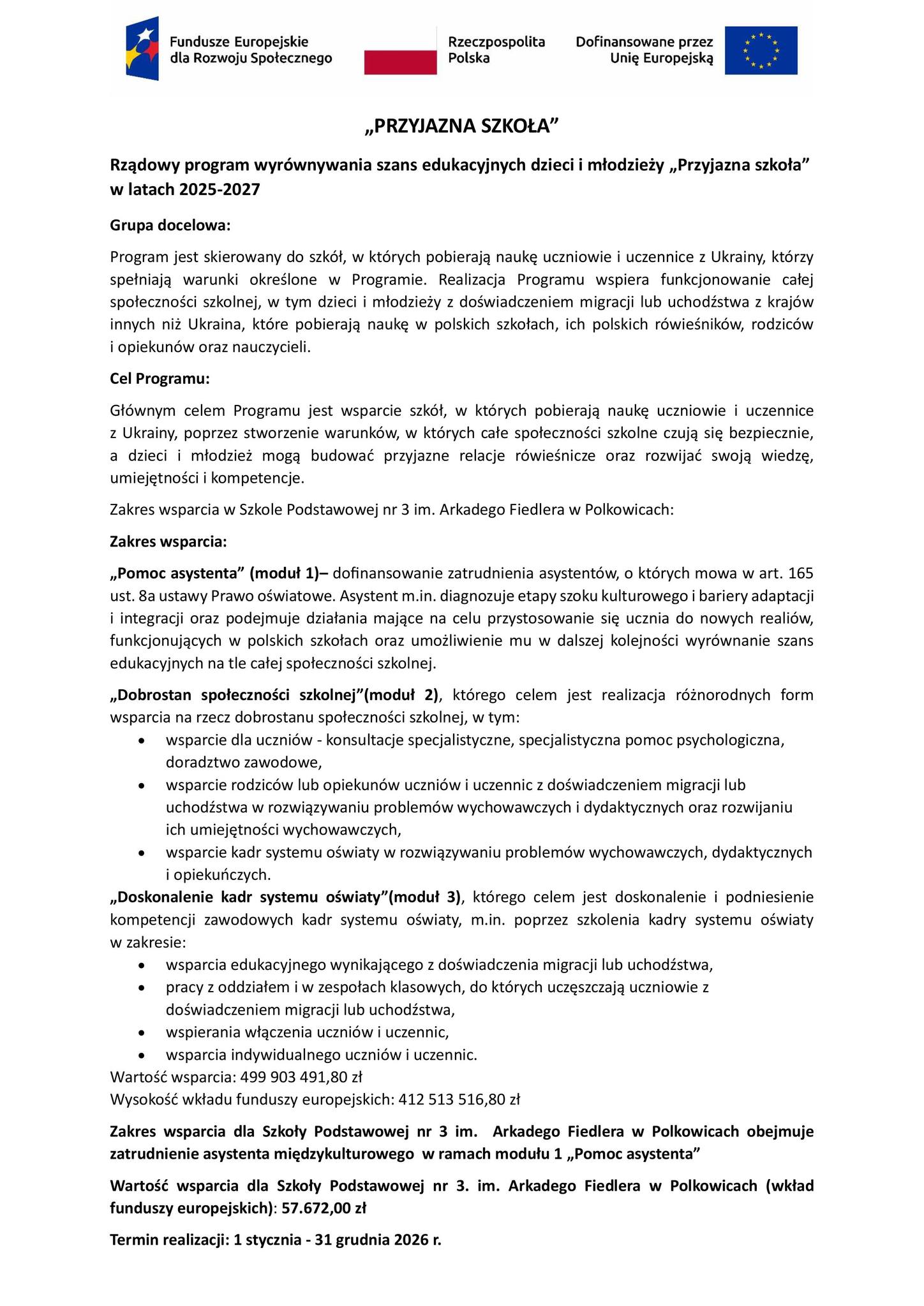 Nasza szkoła przystąpiła do programu „Przyjazna Szkoła”, którego celem jest tworzenie bezpiecznego i przyjaznego środowiska sprzyjającego integracji oraz rozwojowi uczniów, w tym dzieci z Ukrainy i powracających z zagranicy.