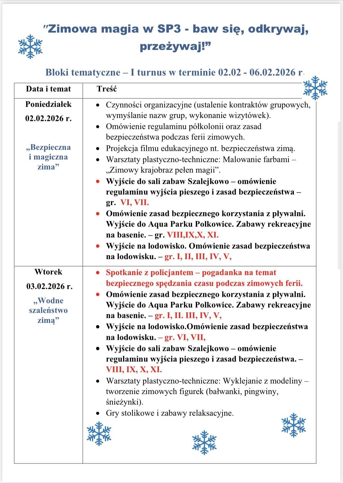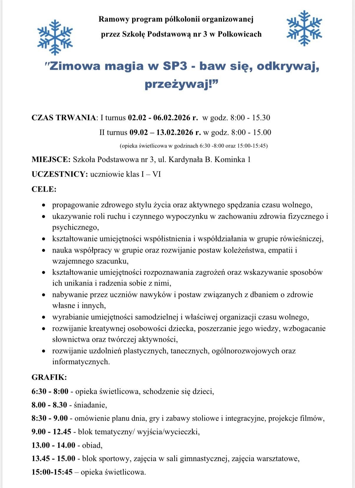 Już w poniedziałek rozpoczynamy tydzień pełen zimowych atrakcji i niezapomnianych emocji! Podczas ferii w SP3 dzieci czeka mnóstwo aktywności, zabawy i kreatywnych wyzwań: warsztaty plastyczno-techniczne, wyjście do kina i rozmowy o filmowych wrażeniach, zimowe szaleństwo na lodowisku, wodne atrakcje w Aqua Parku, zabawa w sali Szalejkowo, całodniowa wycieczka do Hydropolis we Wrocławiu – odkrywamy wodny świat, spotkanie z policjantem – rozmowy o bezpieczeństwie podczas ferii. Nie zabraknie też gier, zabaw ruchowych, wspólnej integracji oraz podsumowania ferii z drobnymi upominkami.