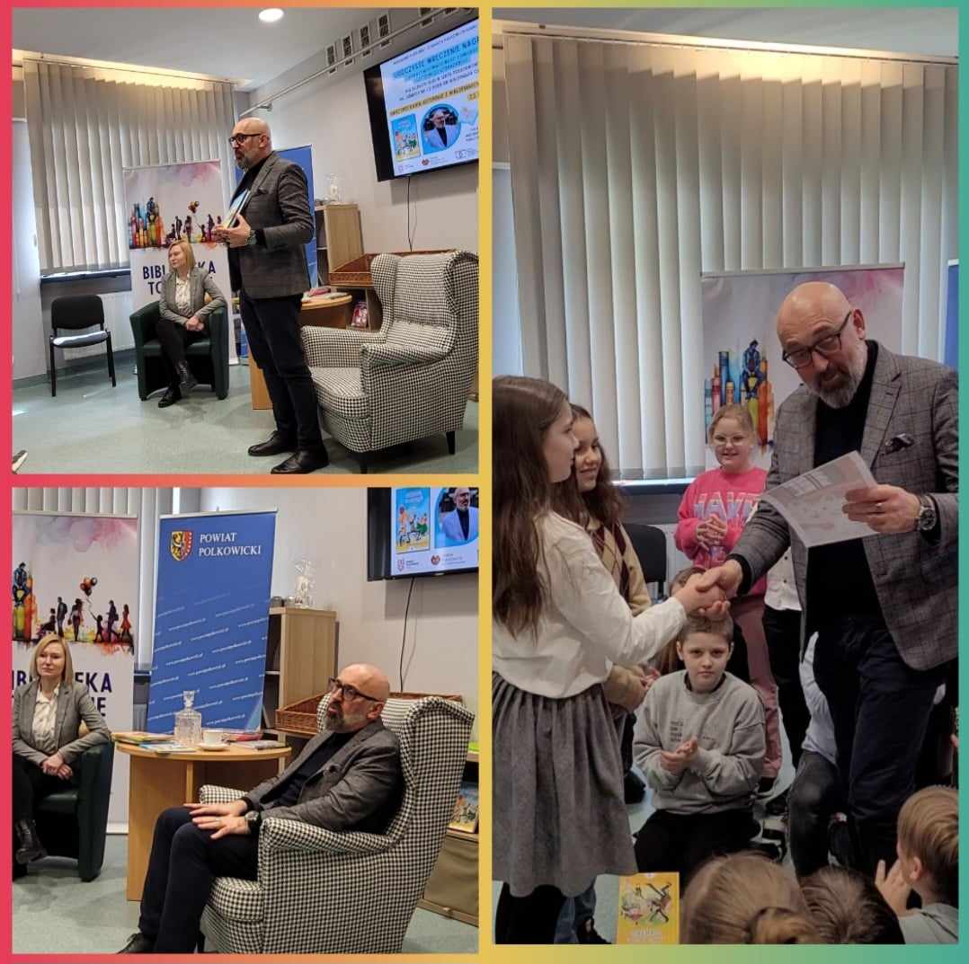 Wiktoria Karkowska z kl. 3c – laureatka 3 miejsca oraz wyróżnieni uczniowie: Klara Białowąs z kl. 3b, Kinga Chodor z kl. 3c i Łukasz Radziszewicz z kl. 3a, odebrali dyplomy i nagrody z rąk autora, wicestarosty powiatu polkowickiego oraz dyrektorki biblioteki.