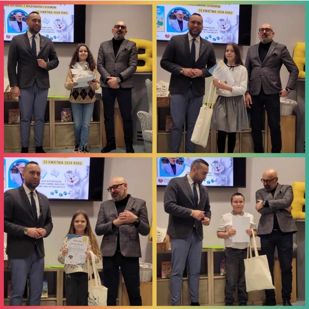 23 kwietnia odbyło się uroczyste wręczenie nagród w powiatowym konkursie literackim „Uśmiech na co dzień od Waldemara Cichonia”, zorganizowanym przez #Biblioteka w Polkowicach, pod Honorowym Patronatem Starosty Polkowickiego - Kamila Ciupaka. Nasi uczniowie napisali piękne konkursowe opowiadania o bibliotecznych przygodach kota Cukierka, bohatera książek Waldemara Cichonia.