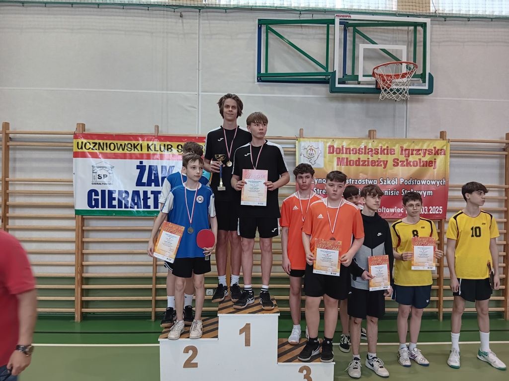 W dniu 12 marca 2025r. W Gierałtowcu odbyły się Drużynowe Mistrzostwa Strefy Legnickiej w tenisie stołowym chłopców. W zawodach wzięło udział 9 drużyn. Nasza szkołę reprezentowało dwóch zawodników: Szymon Florek z klasy 8d oraz Korneliusz Pyrzeński z klasy 8b. Ostatecznie nasi tenisiści zajęli I miejsce i zakwalifikowali się do Finału Wojewódzkiego w Brzegu Dolnym, który odbędzie się 26 marca 2025r. Opiekunem podczas zawodów był Marcin Pawełko. Gratulacje.