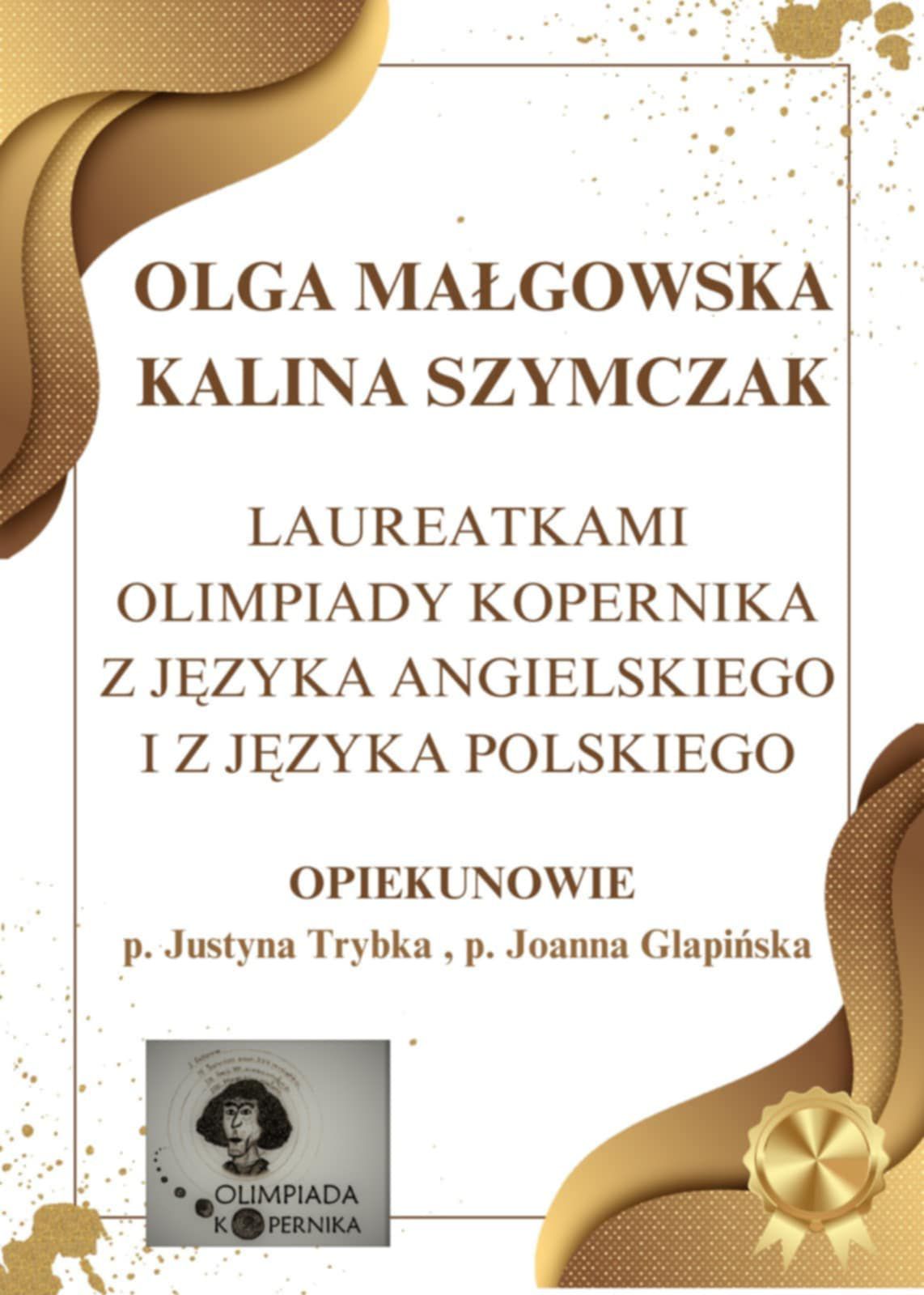 Dnia 18.03.2025 r. przeprowadzony został w I LO w Lubinie etap ustny Olimpiady Kopernika z Języka Angielskiego i z Języka Polskiego. Po podliczeniu wyników z etapu II (pisemnego) i etapu III (ustnego) ostatecznie wyłoniono laureatów, wśród których znalazły się dwie nasze uczennice. Z języka angielskiego naszą szkołę reprezentowała Olga Małgowska z kl. VIIId, a z języka polskiego Kalina Szymczak z kl. VIIIb. Serdecznie gratulujemy laureatkom oraz ich opiekunom - Pani Justynie Trybce i Pani Joannie Glapińskiej. Ogromnie cieszymy się Waszym sukcesem!