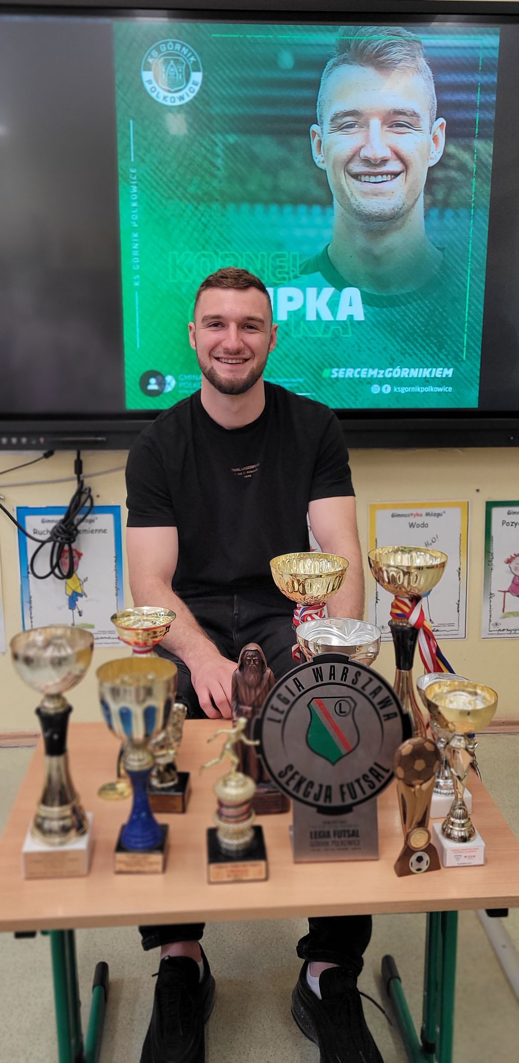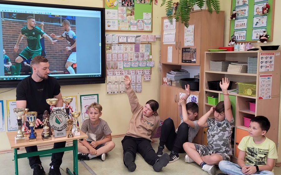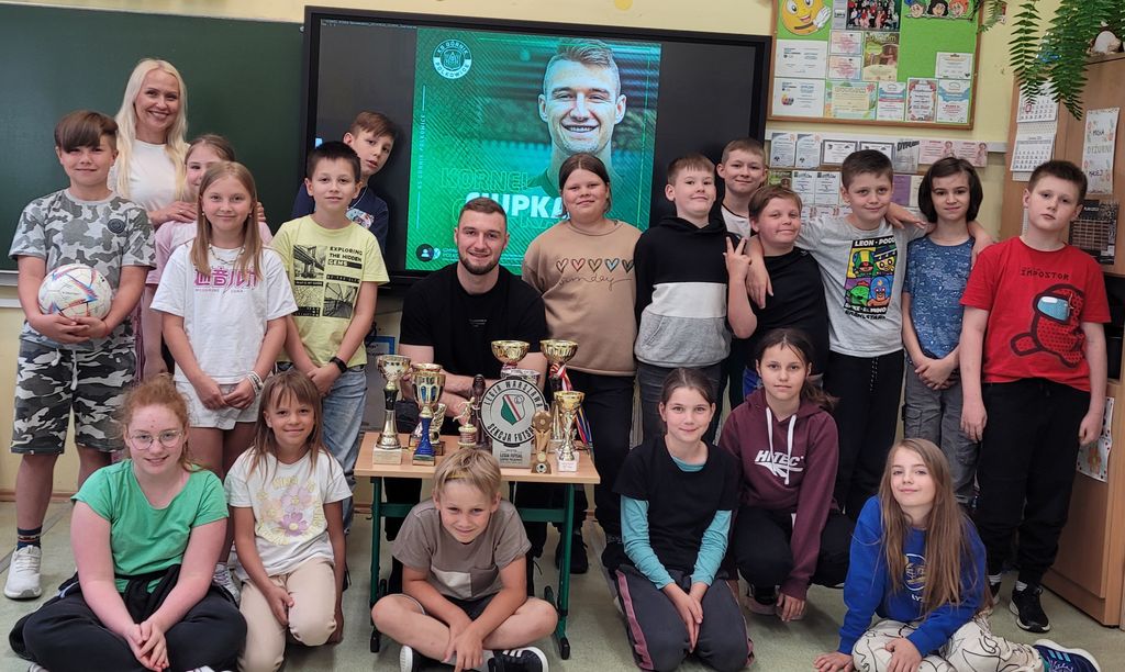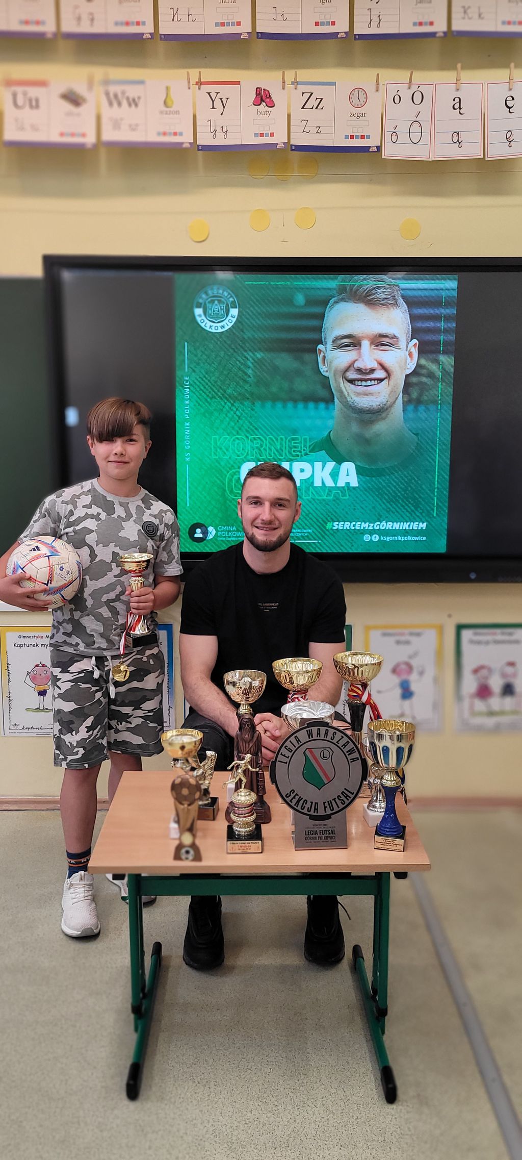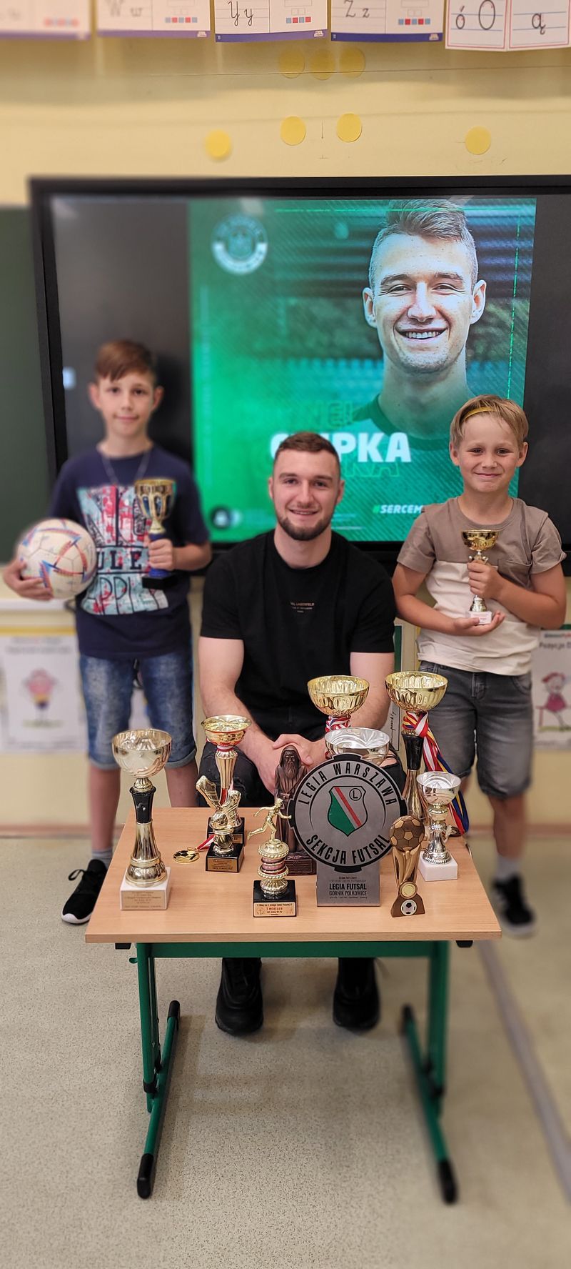11 czerwca, uczniów klasy 3c odwiedził kolejny absolwent naszej szkoły. Tym razem był to Kornel Ciupka, piłkarz z wieloma sukcesami na koncie oraz wolontariusz, organizujący wiele akcji charytatywnych na rzecz bezdomnych zwierząt, m.in. ”Świąteczna paka dla psiaka i kociaka”. Podczas spotkania dzieci dużo dowiedziały się o przebiegu kariery piłkarskiej naszego gościa, o treningach i meczach oraz o radzeniu sobie z przegraną. Porozmawiały również o pomaganiu zwierzakom. Dzieci były pod ogromnym wrażeniem, z wielkim zainteresowaniem oglądały przygotowane przez Pana Kornela filmy i zdjęcia, słuchały jego opowieści, oglądały puchary i medale oraz, tradycyjnie, zadawały mnóstwo pytań. To było fascynujące spotkanie, zakończone rozdaniem autografów i wspólnymi zdjęciami.