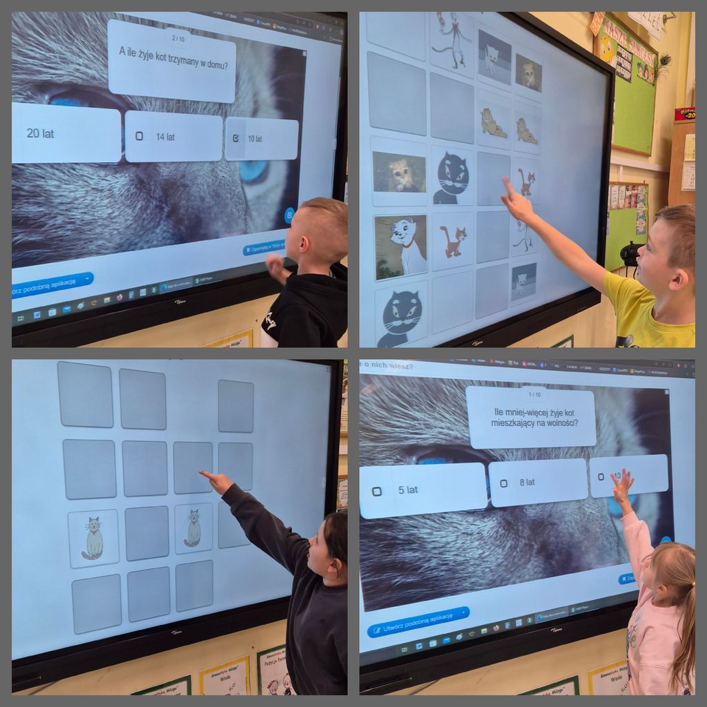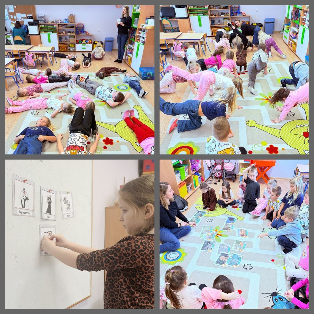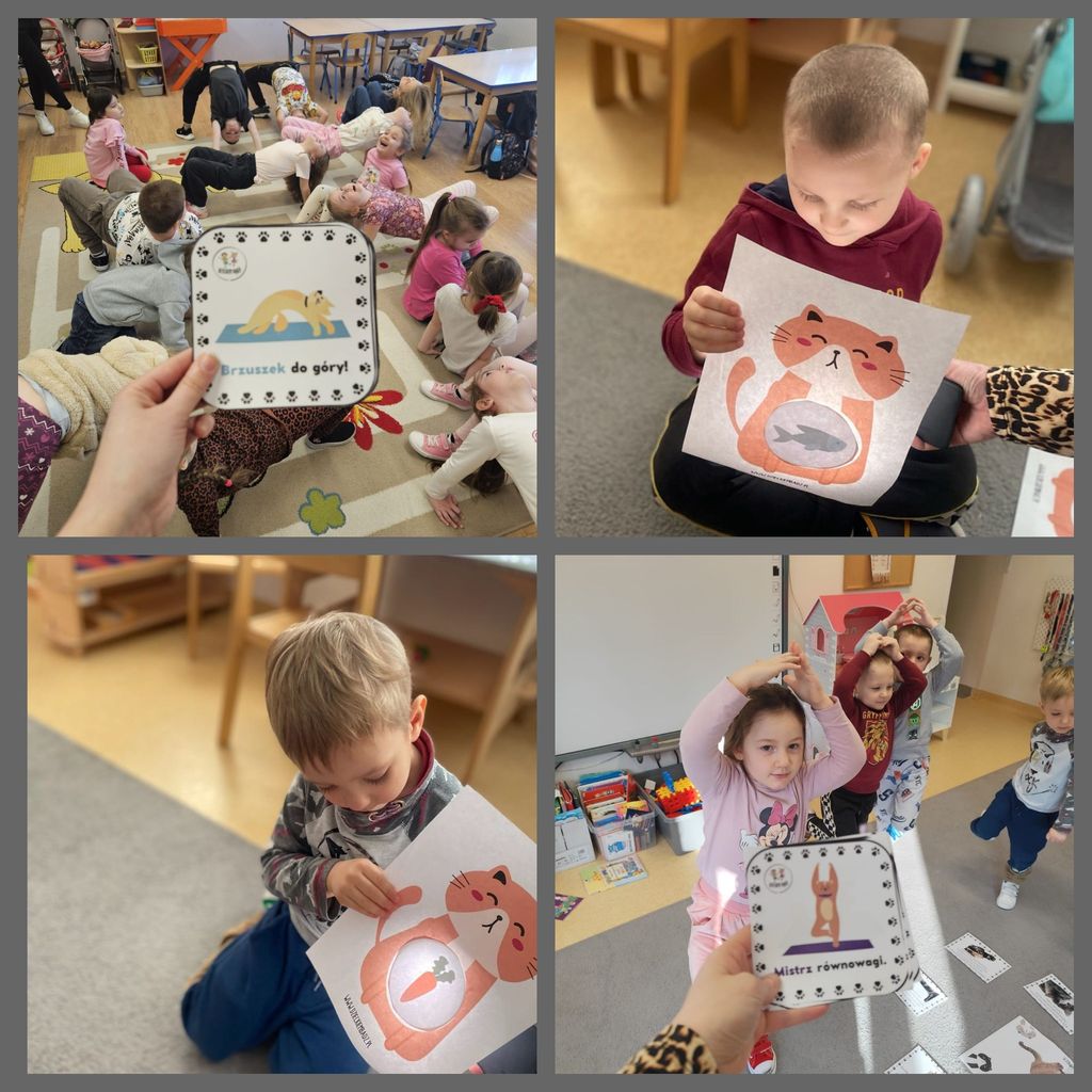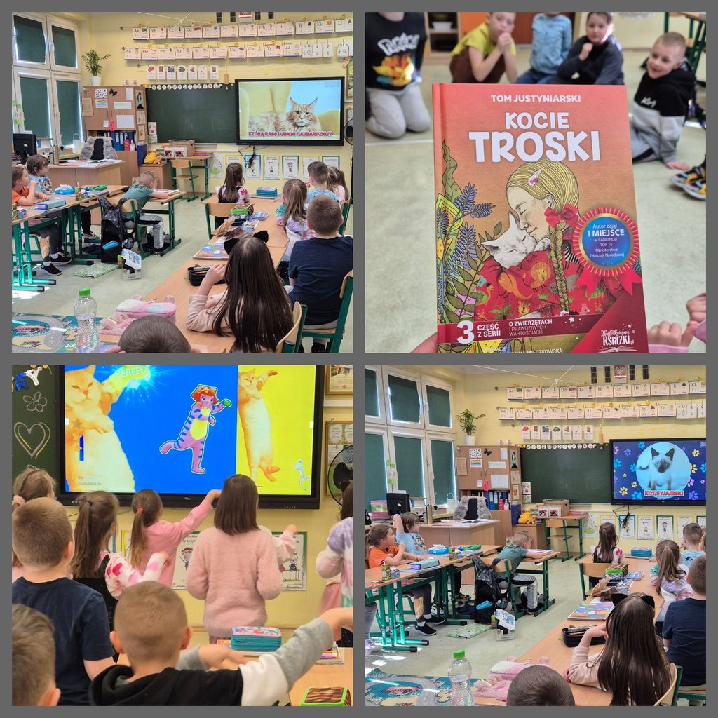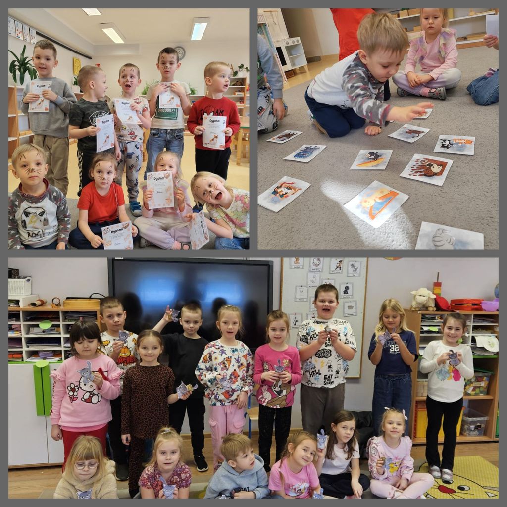 17 lutego przedszkolaki oraz uczniowie klasy pierwszej obchodzili „Światowy Dzień Kota”. W tym dniu dzieci upodobniły się do czworonożnych przyjaciół, poprzez wymalowanie na buziach kocich nosków, wąsów i uszek, zapoznały się z kocimi obyczajami i ciekawostkami oraz wykonały prace plastyczne. Ponadto wzięły udział w wesołych „kocich zabawach" muzyczno - ruchowych, dywanowych oraz interaktywnych i poznały historię pewnego kotka, spisaną w pięknej książeczce pt. "Kocie troski".