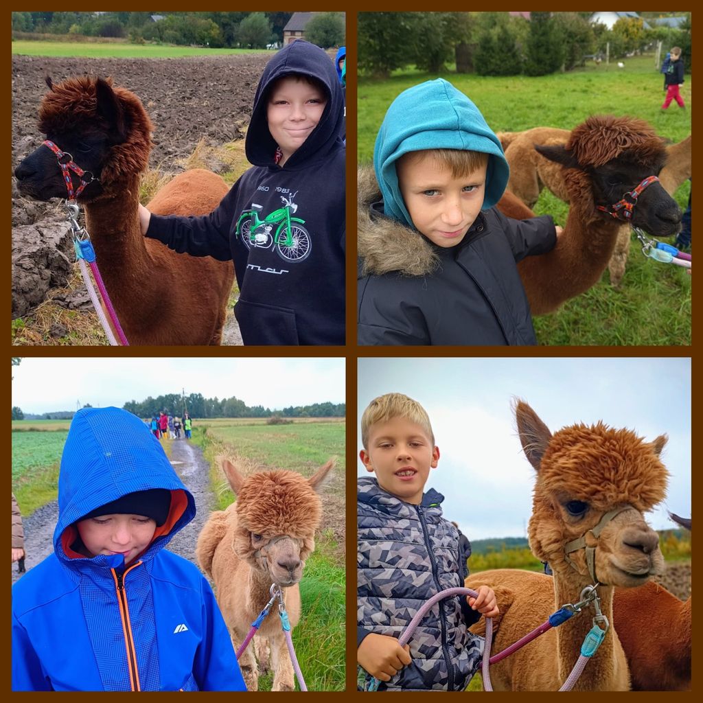 Grupa uczniów z klas drugich i trzecich, pod opieką Pani pedagog Marleny Rudnickiej oraz Pani bibliotekarki - Zuzanny Szczęsnej, uczestniczyła w wyjazdowych warsztatach arteterapeutycznych, które odbyły się w zagrodzie „Alpalogos”- Alpaki z Krainy Wygasłych Wulkanów. Uczestnicy wyruszyli na wyprawę w poszukiwaniu odpowiedzi na pytanie: "Czy dzieciaki lubią alpaki – czy alpaki lubią dzieciaki?". Okazało się, że spotkanie z tymi cudownymi zwierzętami przyniosło dzieciom wiele pozytywnych przeżyć. Spacer z Lusią i Żaklin był prawdziwą frajdą. Uczniowie poznali zachowania alpak i uczyli się wrażliwości wobec zwierząt. Gospodarze wycieczki, pani Martyna i pan Kamil, z pasją opowiadali o życiu tych zwierząt, a także zorganizowali dla dzieci warsztaty artystyczne, ognisko oraz atrakcyjne zabawy. To był fantastyczny dzień, który pomimo jesiennej aury dał wszystkim niesamowicie dużo radości. I teraz dzieci wiedzą już na pewno, że "dzieciaki kochają alpaki, a alpaki kochają dzieciaki".