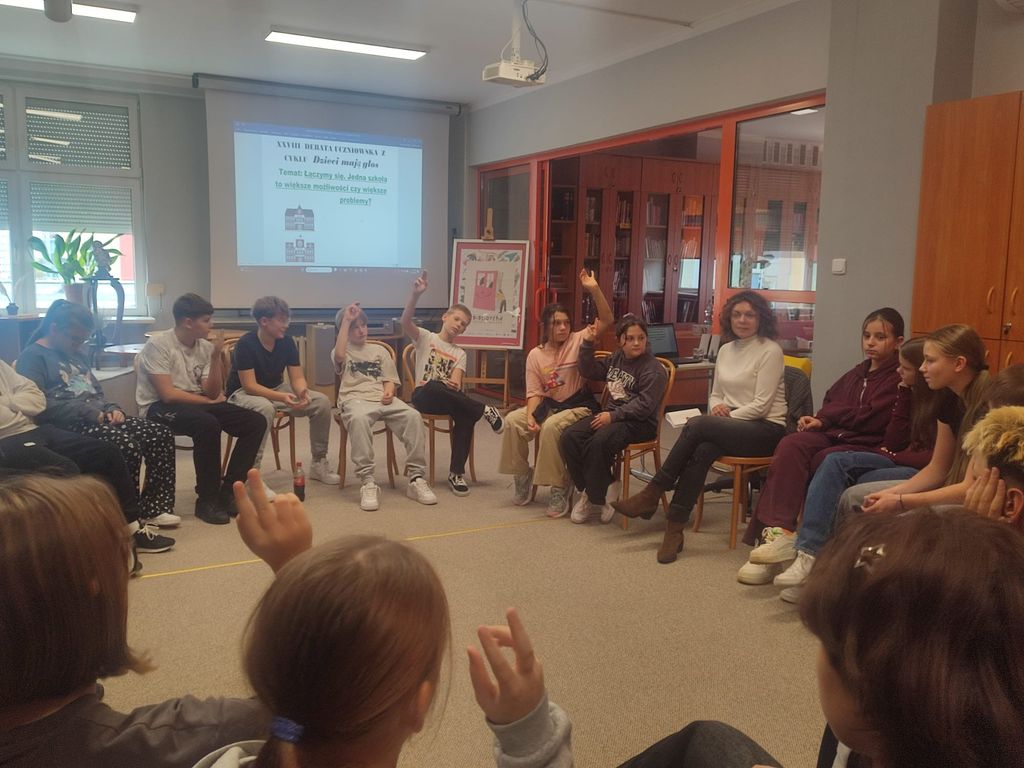 Dnia 15.10.2025r. odbyła się kolejna konferencja uczniowska, pt. „Łączymy się. Jedna szkoła to większe możliwości czy większe problemy?”. Uczniowie klas IV, V i VII wzięli udział w dyskusji, zastanawiając się nad możliwościami i korzyściami, jakie może dać im połączenie się budynków, ale także dzielili się swymi obawami i mogącymi pojawić się problemami.