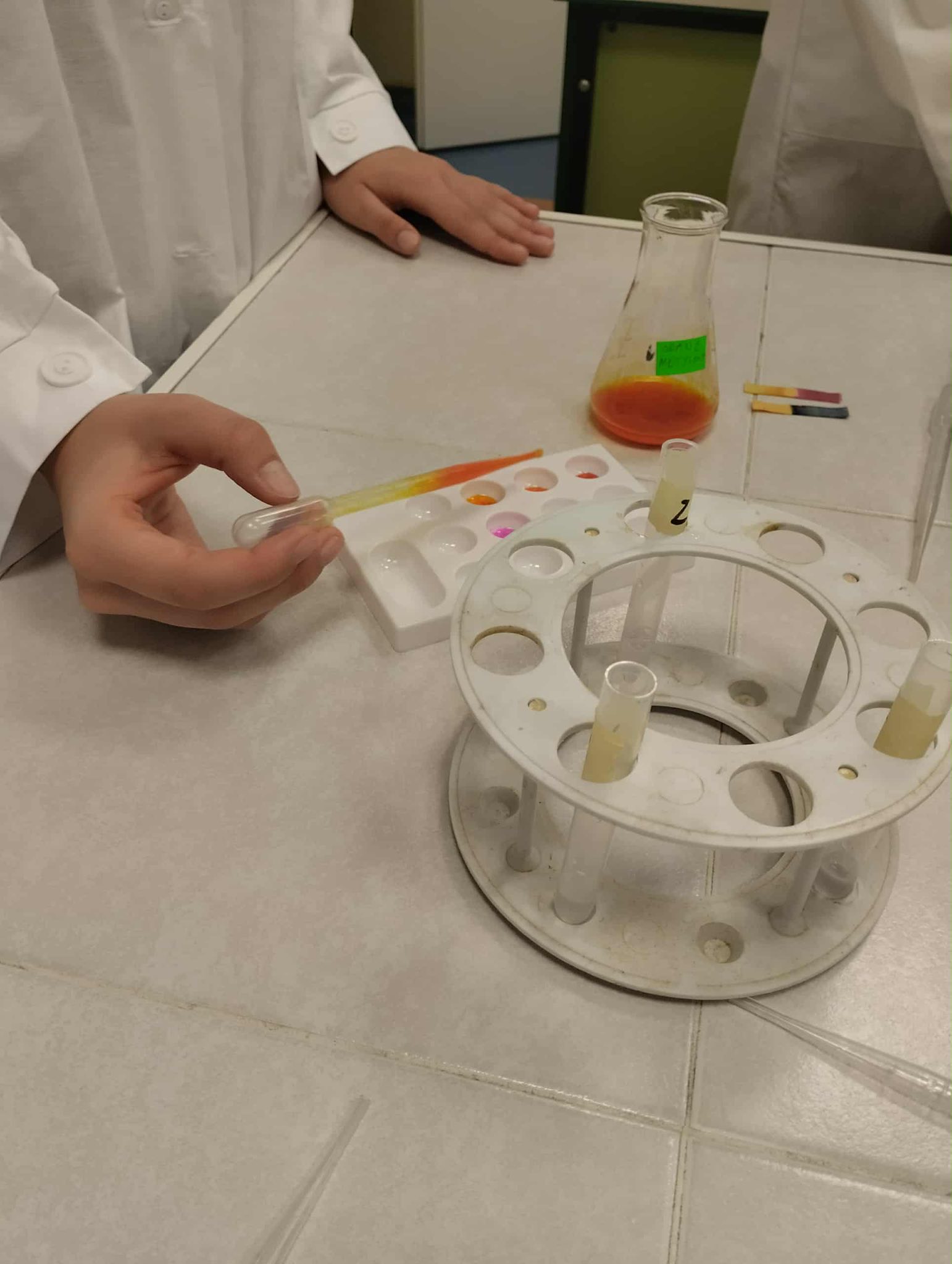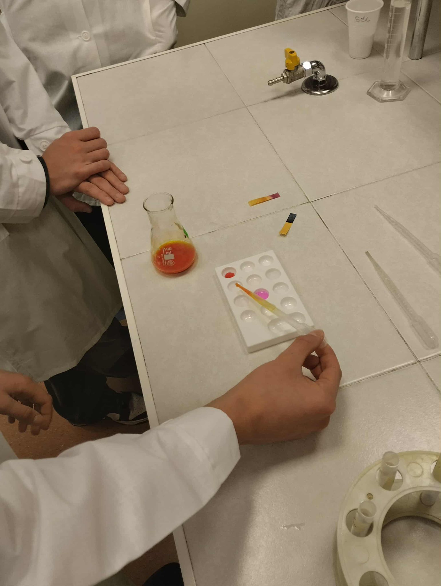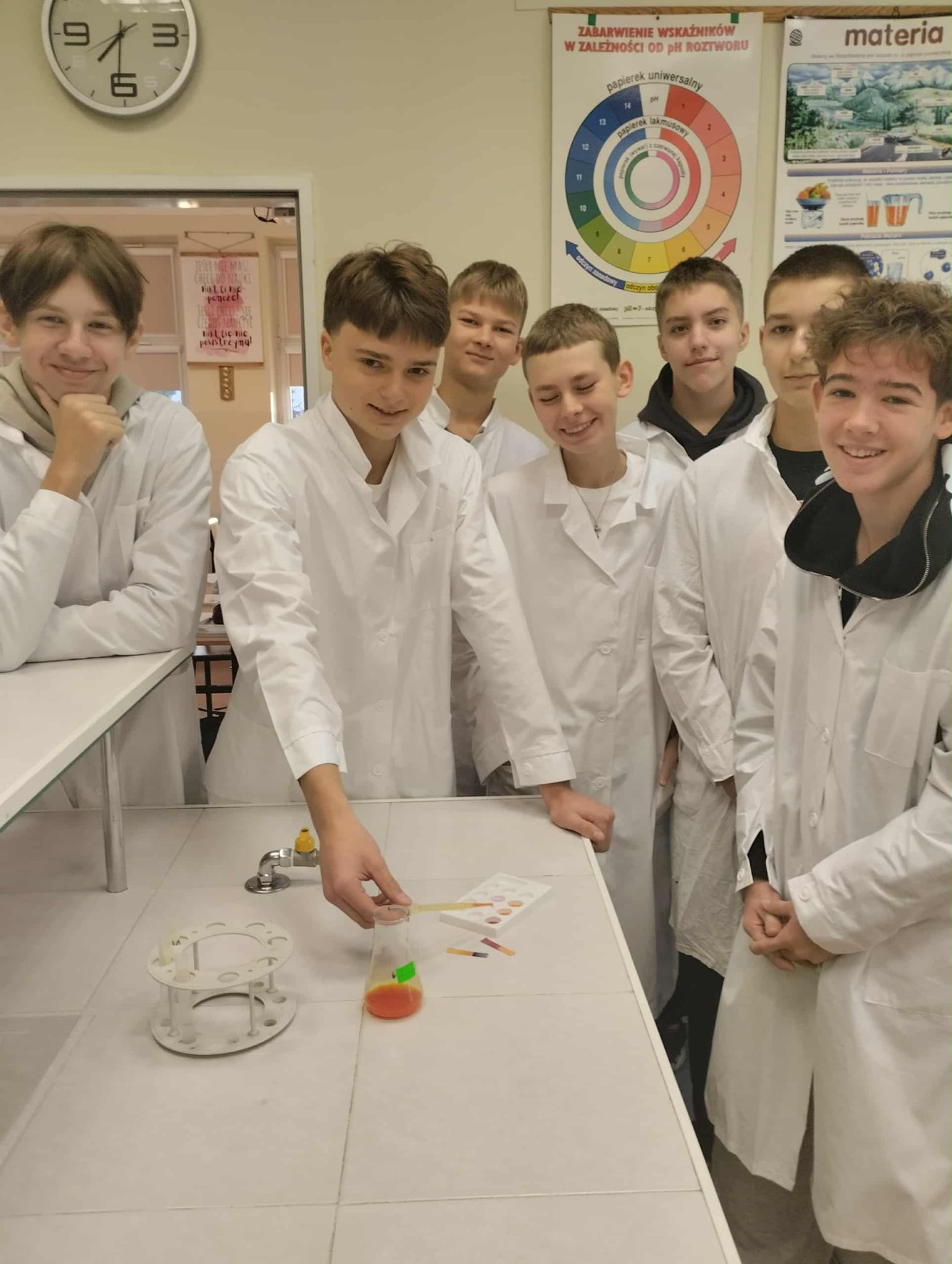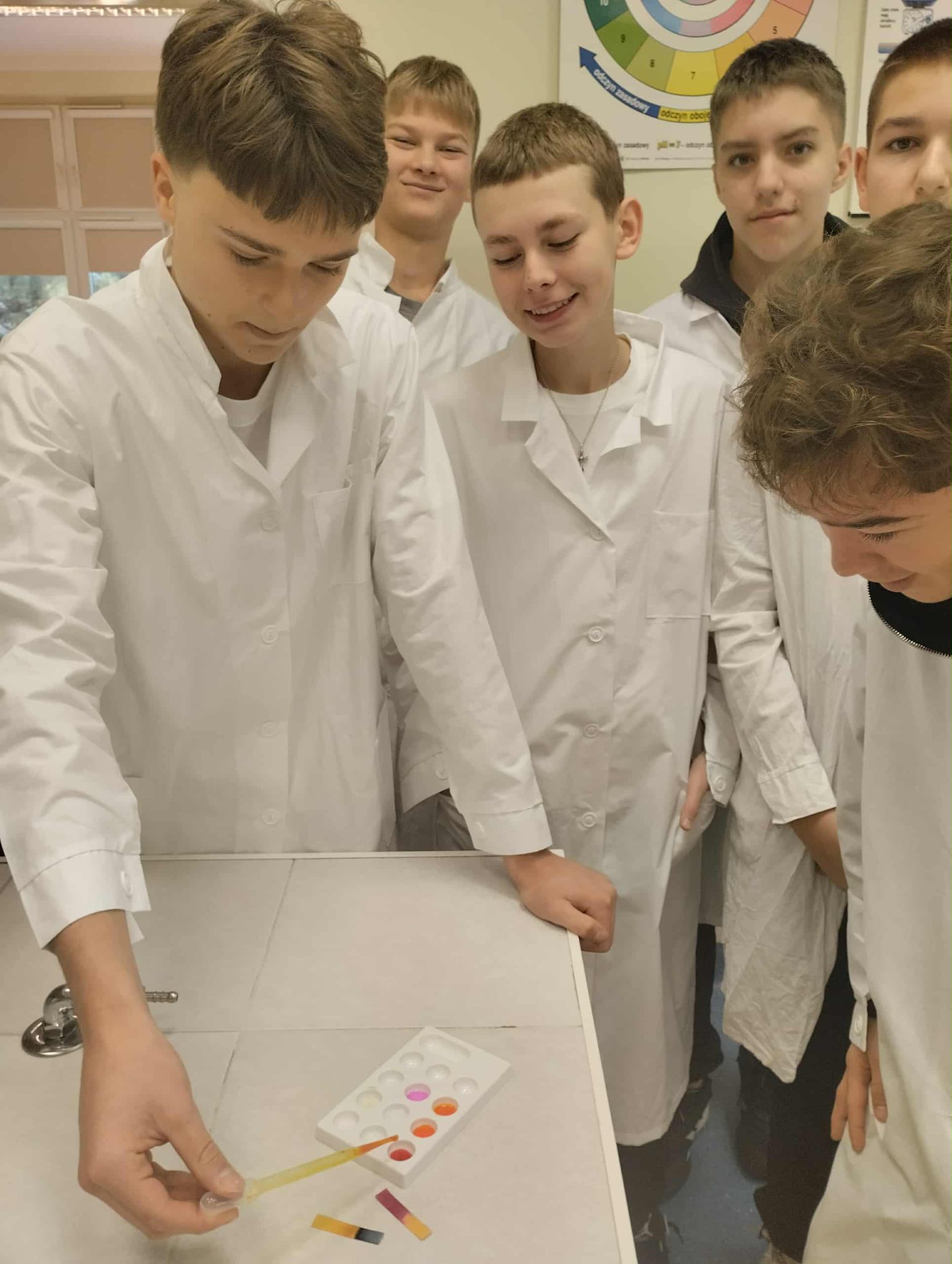 Dziś, 6 listopada, na laboratoryjnych zajęciach chemii uczniowie sprawdzali, jak wskaźniki zmieniają barwę w kwasach i zasadach – i wyszło jak w laboratorium czarodziejów! Było malinowo, czerwono, pomarańczowo, niebiesko a przy tym bardzo naukowo.