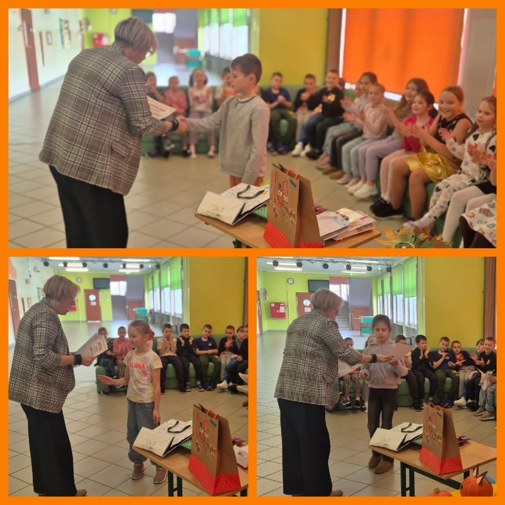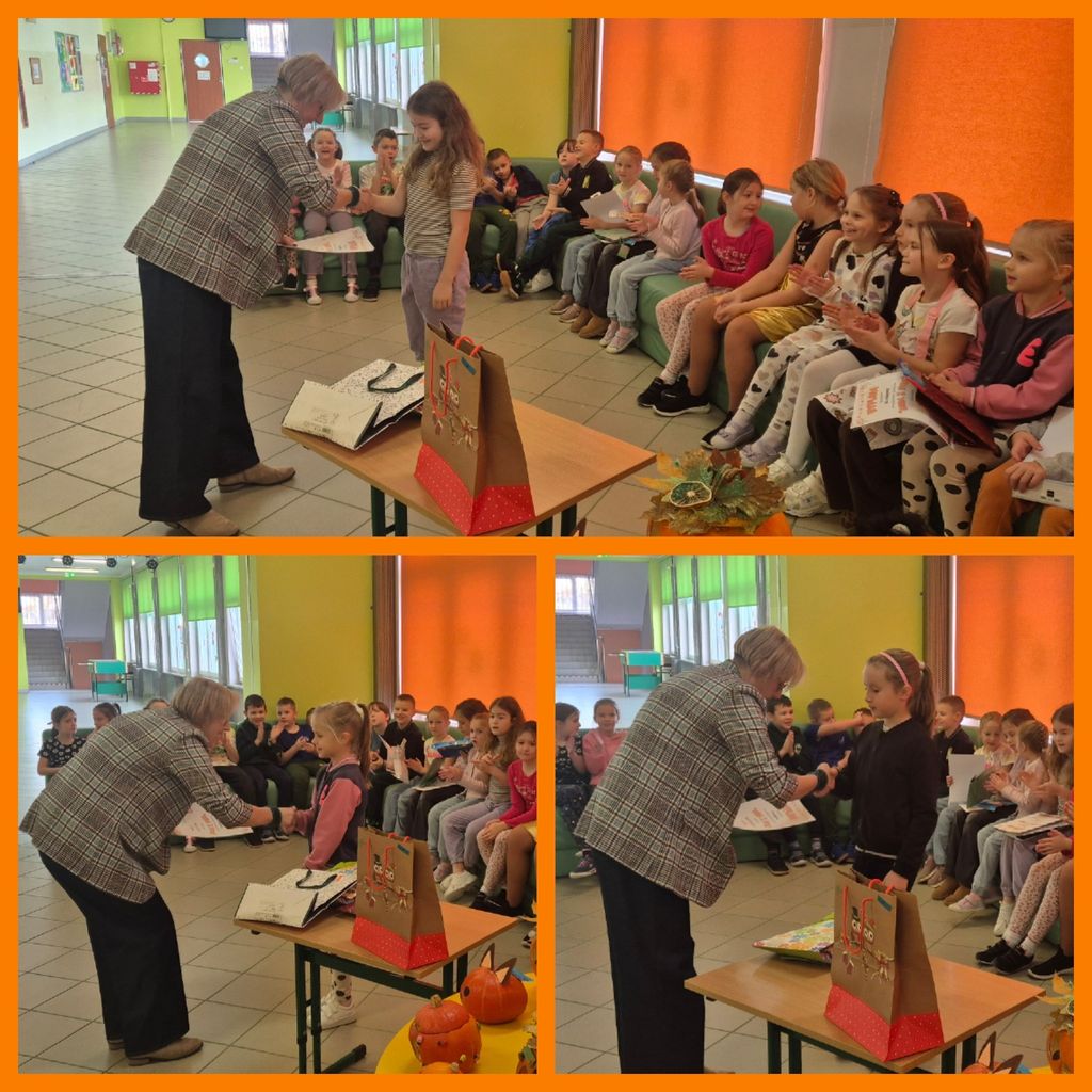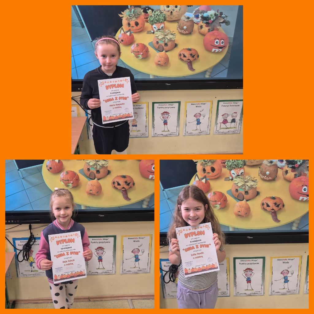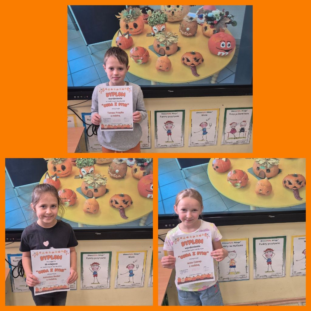 Pragniemy bardzo serdecznie podziękować także Julii M. z klasy 2a, Hani W. z klasy 2b, Gabrysiowi G. z klasy 2b, Kindze D. z klasy 2c, Lence K. z klasy 2d oraz Roksance R. z klasy 2d za przygotowanie wspaniałych dyniowych cudów. Dziękujemy również, a nawet przede wszystkim, Rodzicom wszystkich wymienionych uczniów, za świetne pomysły, super wykonanie, a zwłaszcza za poświęcony czas. Serdecznie gratulujemy zwycięzcom i życzymy kolejnych sukcesów! Dziękujemy Radzie Rodziców za ufundowanie nagród i upominków, a Pani wicedyrektor Amelii Grodeckiej za ich wręczenie.
