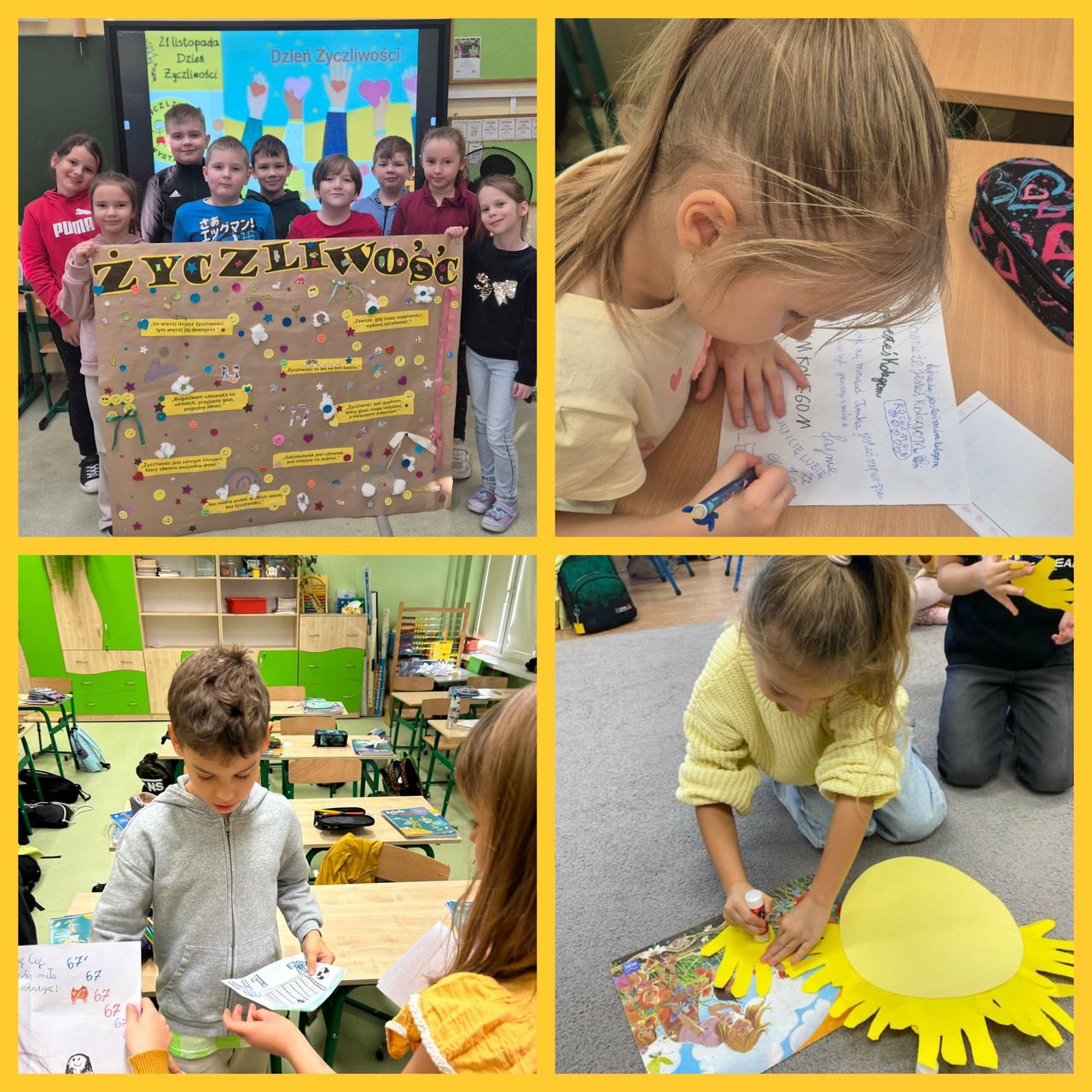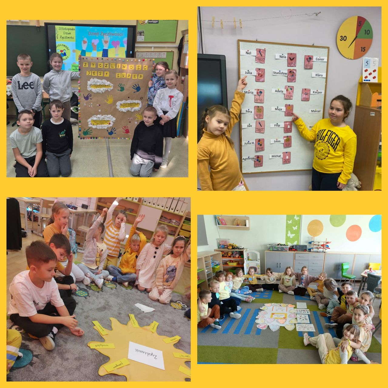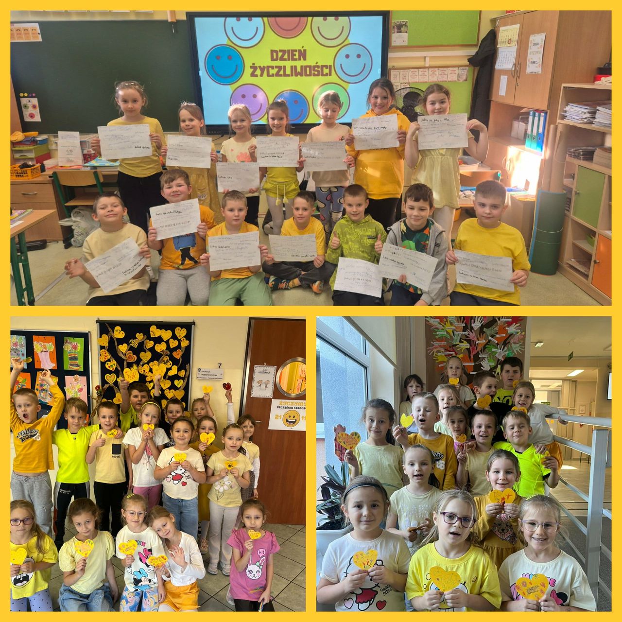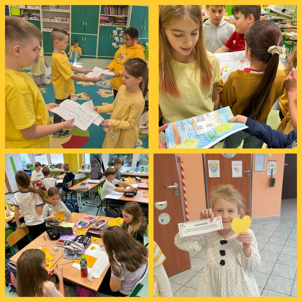 21 listopada klasy 0-3 obchodziły Światowy Dzień Życzliwości i Pozdrowień. W tym dniu uczniowie i nauczyciele ubrani byli na żółto. Dzieci, zarówno w swoich klasach, jak i podczas przerw oraz zajęć w świetlicy, wzięły udział w różnych aktywnościach promujących miłe słowa, dobre uczynki oraz wzajemny szacunek. Były rozmowy o tym, czym jest życzliwość i dlaczego warto być dla siebie dobrym każdego dnia. Poruszono również temat Praw Dziecka. Ponadto dzieci wykonały przeróżne prace plastyczne związane z życzliwością. Każda klasa wykonała również plakat promujący życzliwość. Wszystkie dzieła można było podziwiać na szkolnym korytarzu, w "Alejce Życzliwości". W klasach odbyły się także zabawy integracyjne, takie jak „Pudełko komplementów” czy „Łańcuch dobrych uczynków”. Na szkolnym holu wyrosło "Drzewo Życzliwości", które, dzięki uczniom, rozkwitło żółtymi serduszkami, pełnymi dobrych, miłych, życzliwych słów. Dzieci z ogromną radością przygotowywały liściki pełne dobra i wymieniały się nimi z kolegami. Tego dnia atmosfera w szkole była wyjątkowo radosna, a uczniowie starali się okazywać sobie życzliwość zarówno słowem, jak i zachowaniem. Obchody Dnia Życzliwości przypomniały wszystkim, że nawet drobny gest może sprawić komuś przyjemność i poprawić humor.