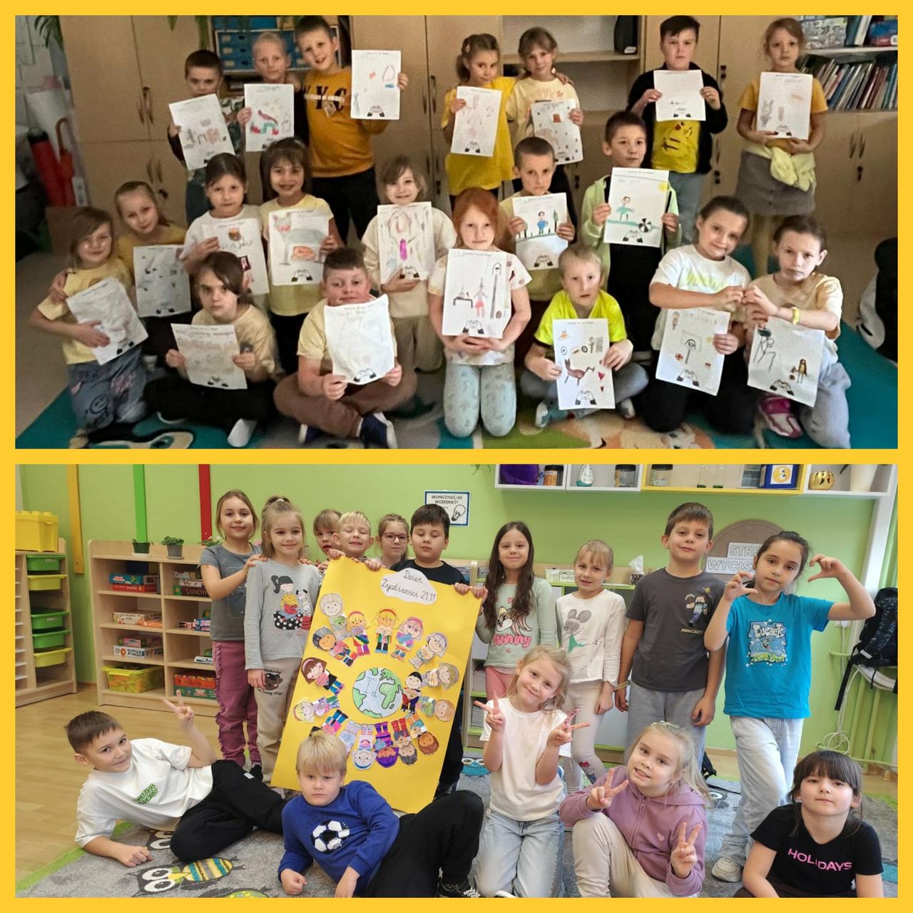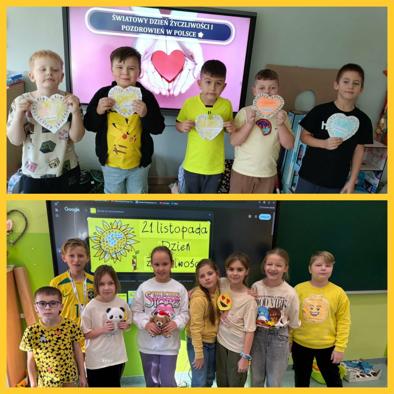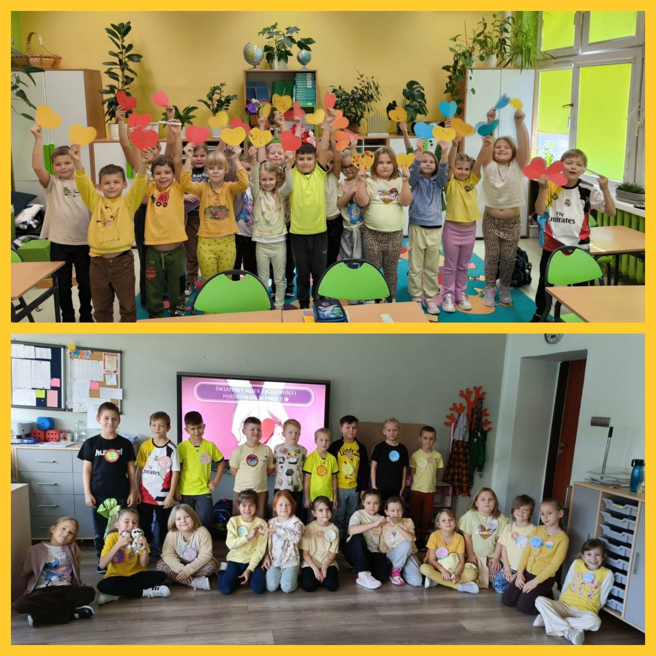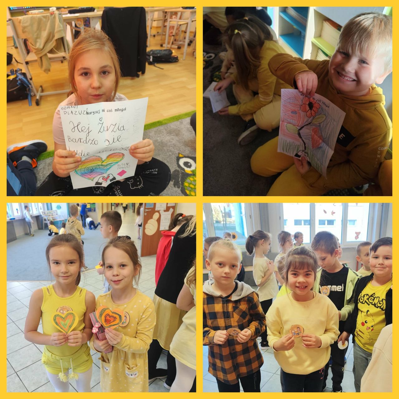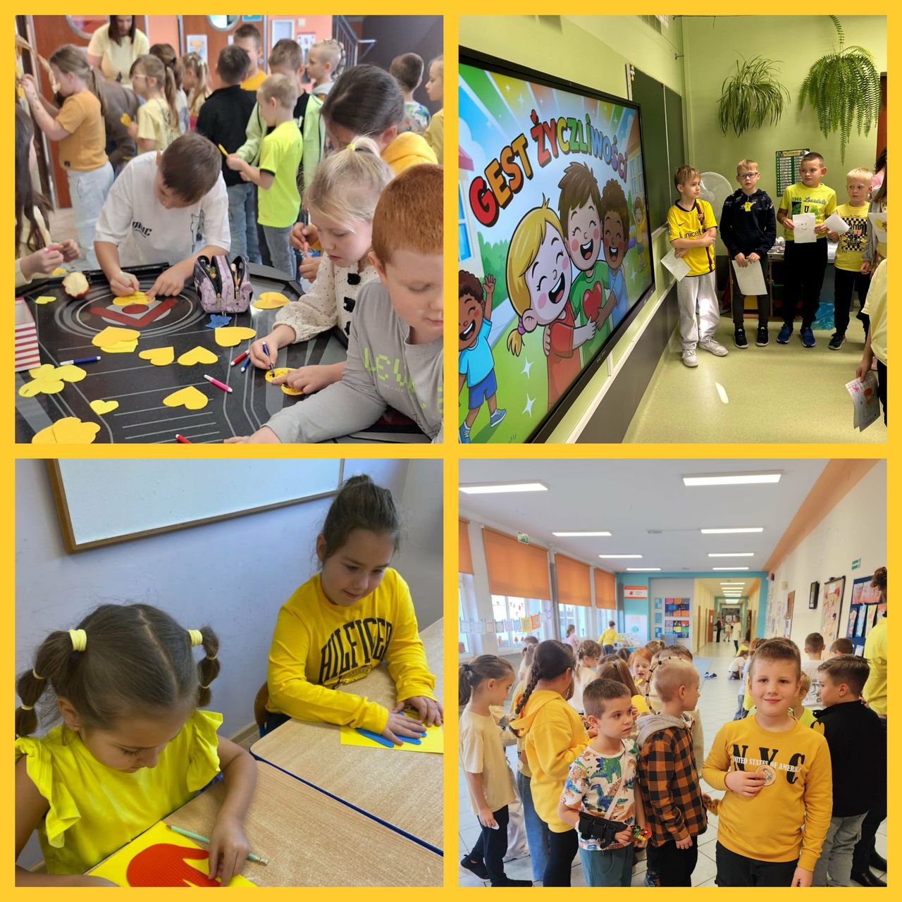 21 listopada klasy 0-3 obchodziły Światowy Dzień Życzliwości i Pozdrowień. W tym dniu uczniowie i nauczyciele ubrani byli na żółto. Dzieci, zarówno w swoich klasach, jak i podczas przerw oraz zajęć w świetlicy, wzięły udział w różnych aktywnościach promujących miłe słowa, dobre uczynki oraz wzajemny szacunek. Były rozmowy o tym, czym jest życzliwość i dlaczego warto być dla siebie dobrym każdego dnia. Poruszono również temat Praw Dziecka. Ponadto dzieci wykonały przeróżne prace plastyczne związane z życzliwością. Każda klasa wykonała również plakat promujący życzliwość. Wszystkie dzieła można było podziwiać na szkolnym korytarzu, w "Alejce Życzliwości". W klasach odbyły się także zabawy integracyjne, takie jak „Pudełko komplementów” czy „Łańcuch dobrych uczynków”. Na szkolnym holu wyrosło "Drzewo Życzliwości", które, dzięki uczniom, rozkwitło żółtymi serduszkami, pełnymi dobrych, miłych, życzliwych słów. Dzieci z ogromną radością przygotowywały liściki pełne dobra i wymieniały się nimi z kolegami. Tego dnia atmosfera w szkole była wyjątkowo radosna, a uczniowie starali się okazywać sobie życzliwość zarówno słowem, jak i zachowaniem. Obchody Dnia Życzliwości przypomniały wszystkim, że nawet drobny gest może sprawić komuś przyjemność i poprawić humor.