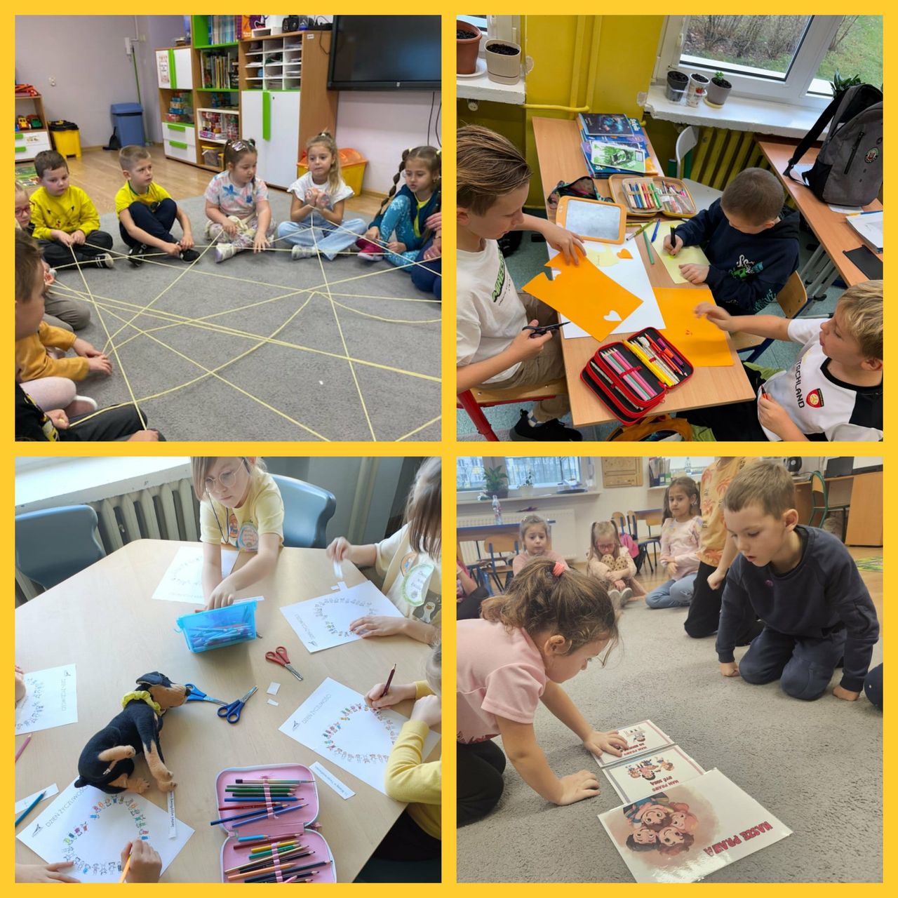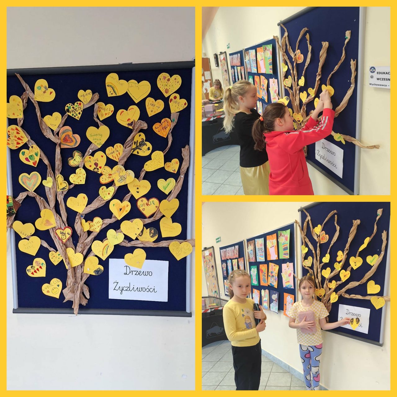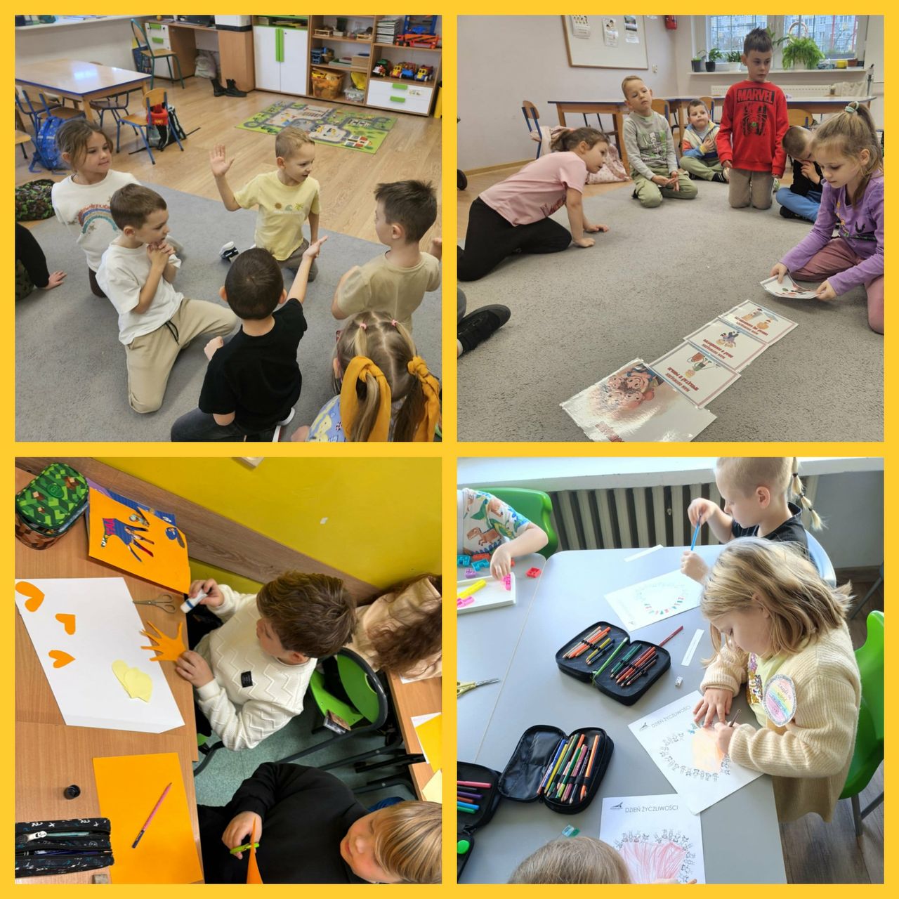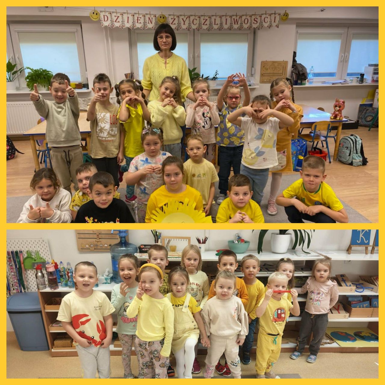 21 listopada klasy 0-3 obchodziły Światowy Dzień Życzliwości i Pozdrowień. W tym dniu uczniowie i nauczyciele ubrani byli na żółto. Dzieci, zarówno w swoich klasach, jak i podczas przerw oraz zajęć w świetlicy, wzięły udział w różnych aktywnościach promujących miłe słowa, dobre uczynki oraz wzajemny szacunek. Były rozmowy o tym, czym jest życzliwość i dlaczego warto być dla siebie dobrym każdego dnia. Poruszono również temat Praw Dziecka. Ponadto dzieci wykonały przeróżne prace plastyczne związane z życzliwością. Każda klasa wykonała również plakat promujący życzliwość. Wszystkie dzieła można było podziwiać na szkolnym korytarzu, w "Alejce Życzliwości". W klasach odbyły się także zabawy integracyjne, takie jak „Pudełko komplementów” czy „Łańcuch dobrych uczynków”. Na szkolnym holu wyrosło "Drzewo Życzliwości", które, dzięki uczniom, rozkwitło żółtymi serduszkami, pełnymi dobrych, miłych, życzliwych słów. Dzieci z ogromną radością przygotowywały liściki pełne dobra i wymieniały się nimi z kolegami. Tego dnia atmosfera w szkole była wyjątkowo radosna, a uczniowie starali się okazywać sobie życzliwość zarówno słowem, jak i zachowaniem. Obchody Dnia Życzliwości przypomniały wszystkim, że nawet drobny gest może sprawić komuś przyjemność i poprawić humor.