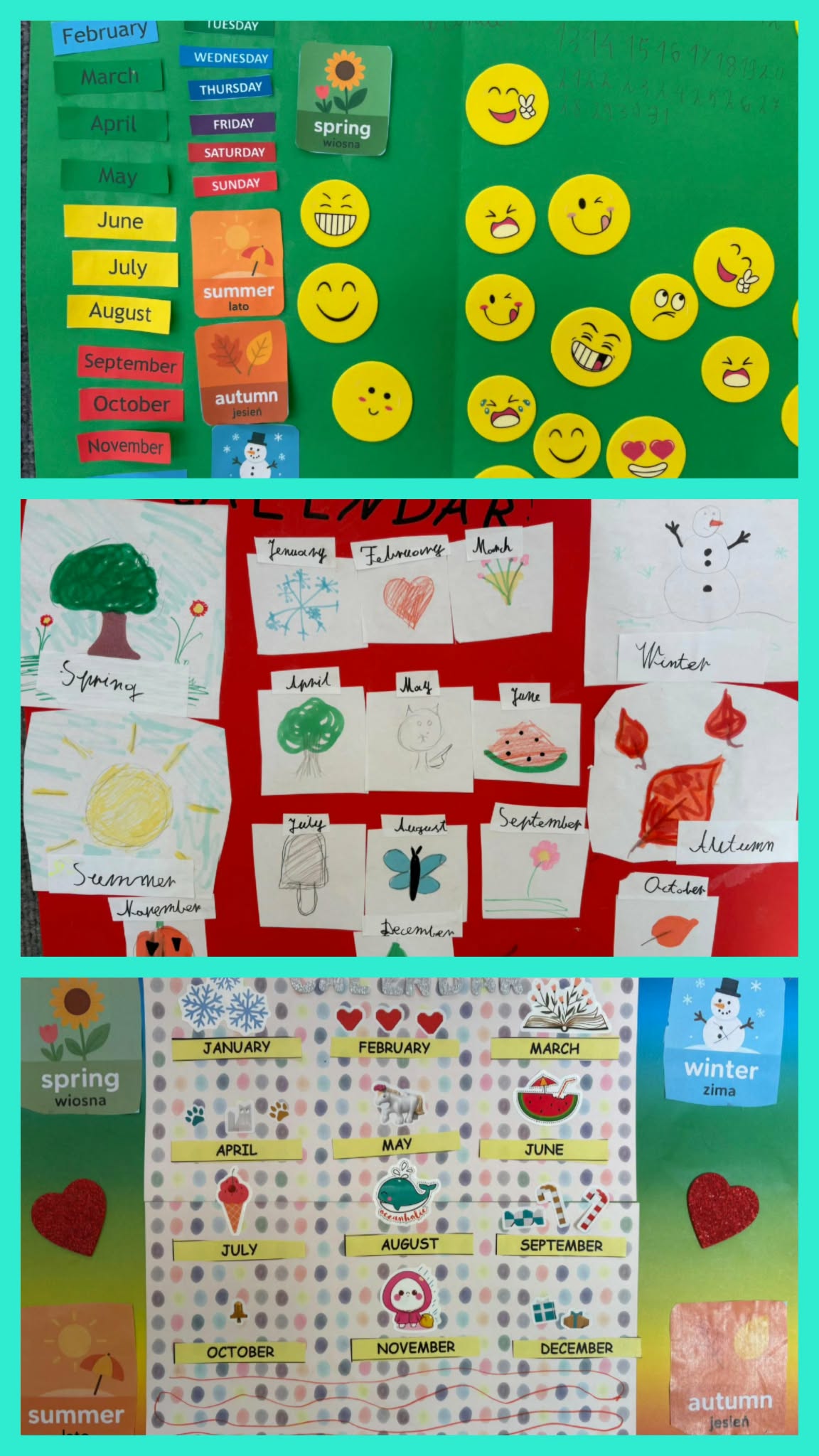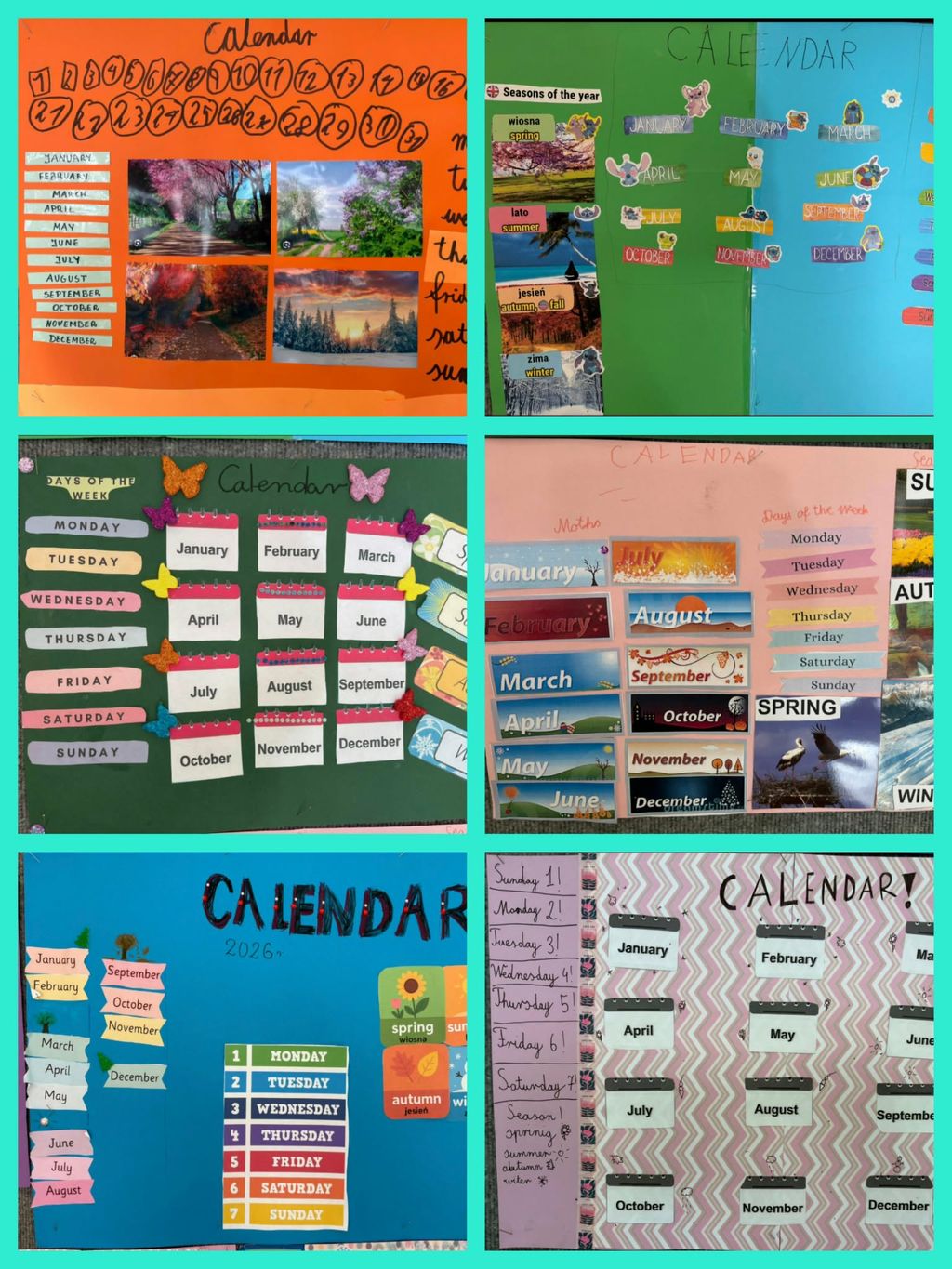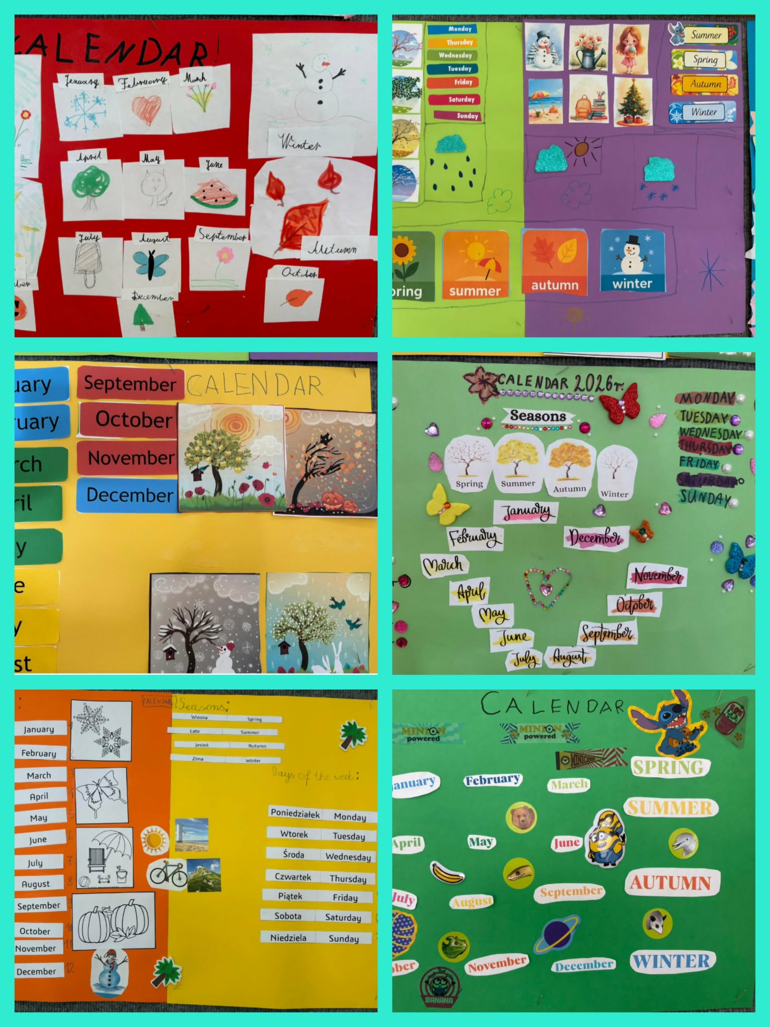 Uczniowie klas trzecich, podczas kilku kolejnych lekcji języka angielskiego, poznawali nazwy miesięcy, pór roku oraz dni tygodnia. Zdobytą wiedzę wykorzystali w praktyce, tworząc własne, kolorowe kalendarze. Efekty ich pracy można podziwiać na tablicach w sali języka angielskiego. Zapraszamy do obejrzenia tych kreatywnych i starannie wykonanych prac!