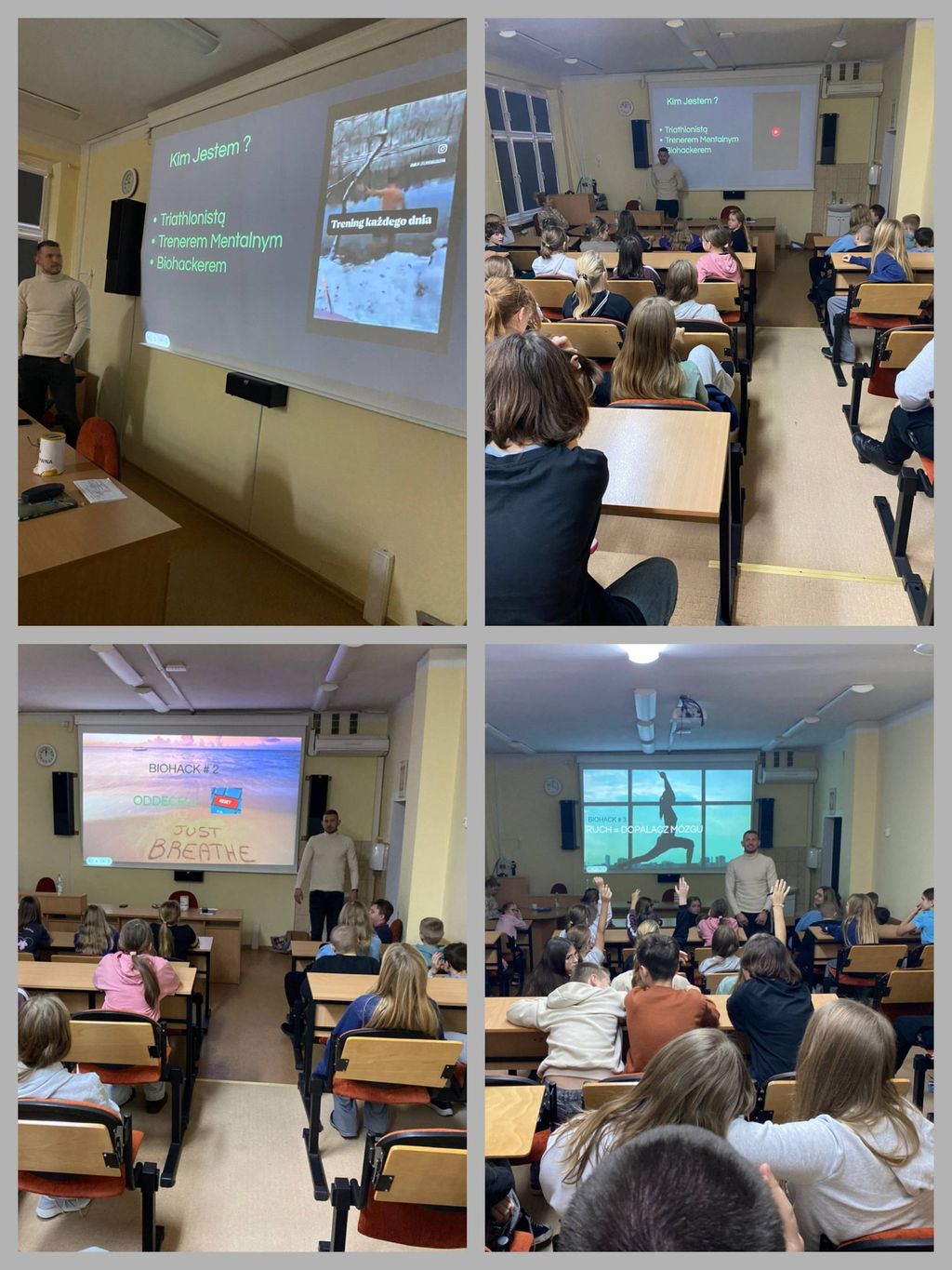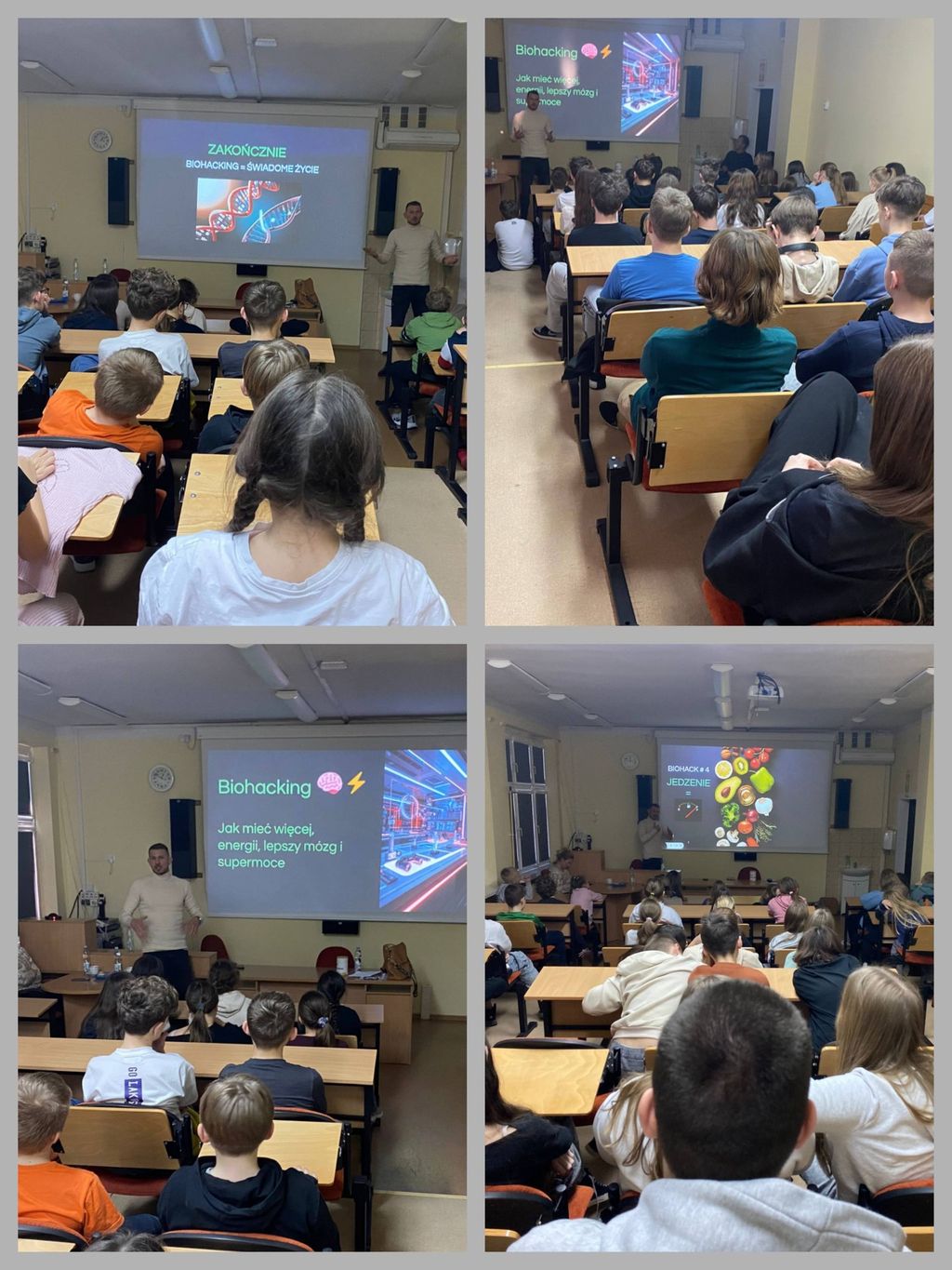 Biohacking: czyli jak mieć więcej energii niż telefon naładowany na 100%. Pan Adrian Wiatrowski - Trener Personalny - w nowoczesny, ciekawy sposób wprowadził uczniów w temat dbania o zdrowie, energię i koncentrację. Uczniowie poznali pojęcie "biohackingu" w prostym języku – jako „ładowanie baterii swojego ciała i mózgu”. Dowiedzieli się, dlaczego sen, zdrowe jedzenie, ruch, oddech i woda są kluczowe dla ich energii i dobrego samopoczucia. Ich organizmy i styl życia porównywane były do telefonu, komputera i gier. Uczniowie otrzymali podstawy zdrowego stylu życia w lekkiej, nowoczesnej formie oraz odkryli, że dbanie o siebie może być proste i całkiem przyjemne.