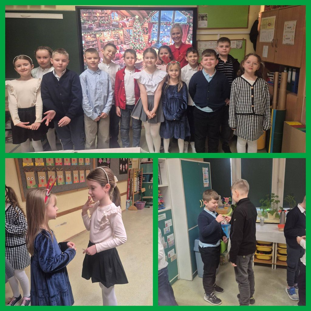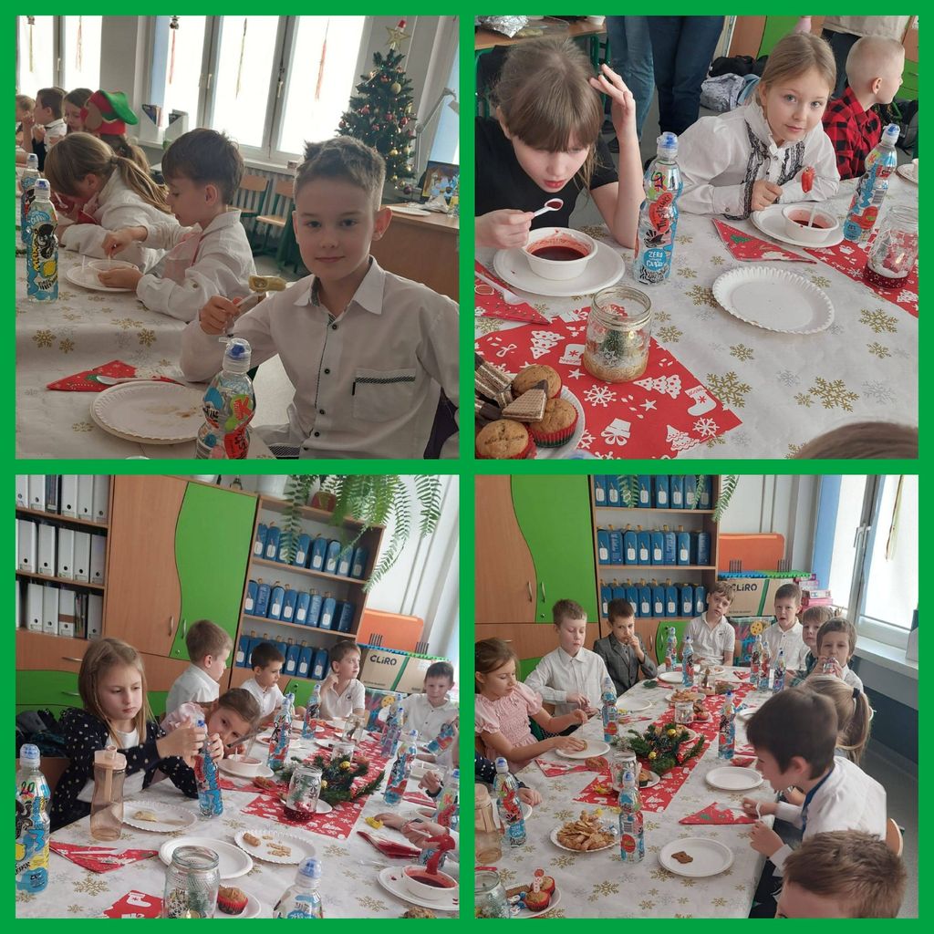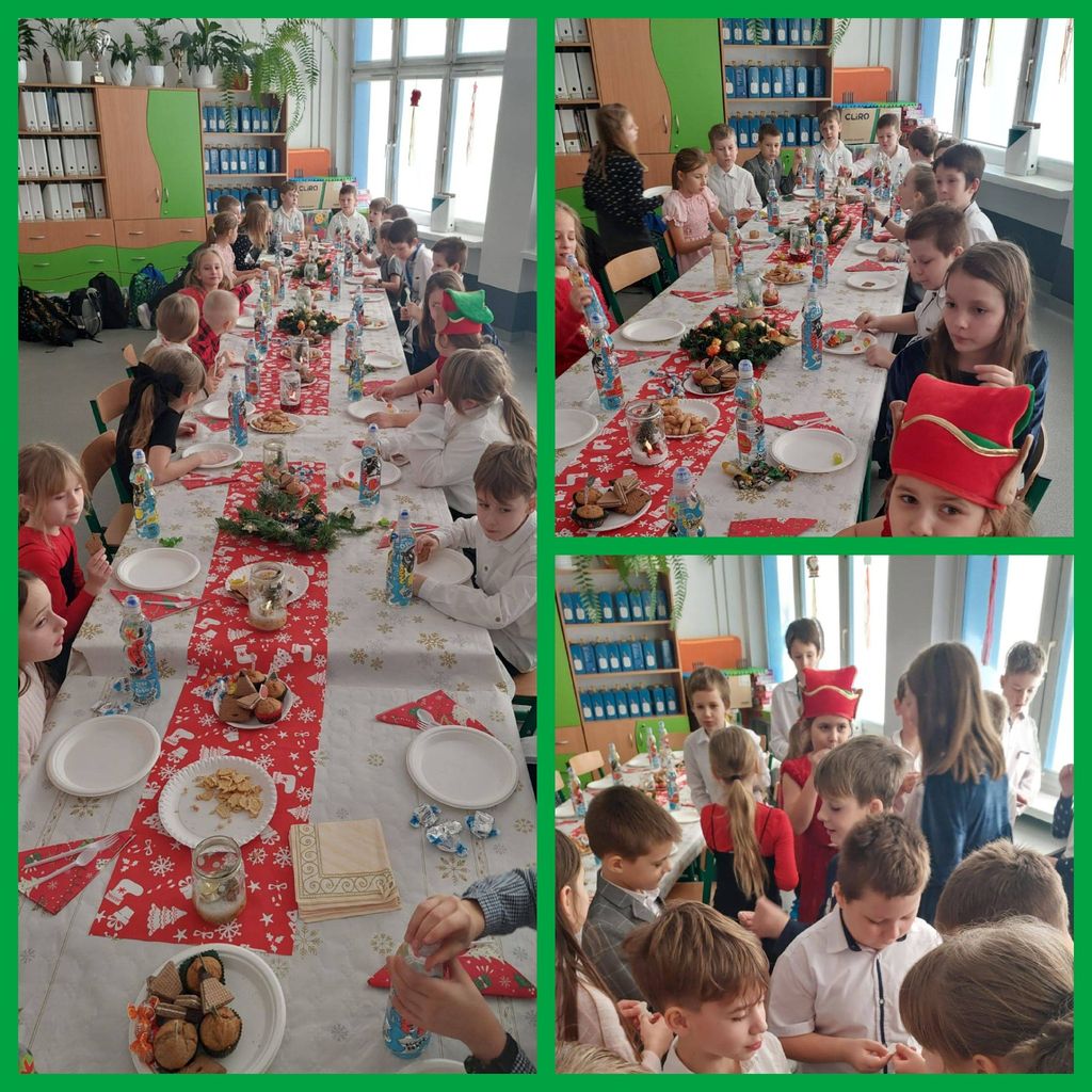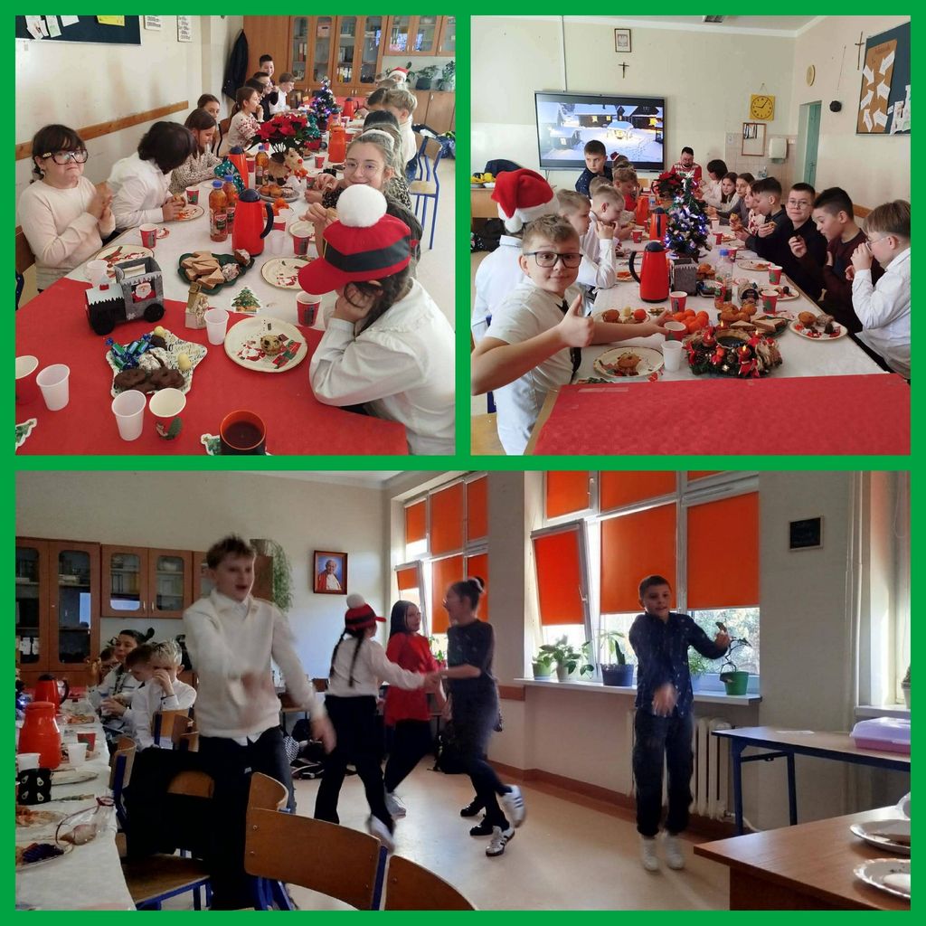 19 grudnia we wszystkich klasach naszej szkoły odbyły się klasowe wigilie, które wprowadziły uczniów oraz nauczycieli w świąteczny nastrój i zbliżyły do siebie całą społeczność klasową. Wigilie rozpoczęło wspólne dzielenie się opłatkiem, co było momentem szczególnej serdeczności. Wszyscy składali sobie nawzajem życzenia zdrowia, szczęścia oraz sukcesów w nadchodzącym roku. Następnie zasiedli do stołów, gdzie czekały tradycyjne potrawy wigilijne: barszcz, pierogi, a także dużo słodkości - ciast, babeczek i oczywiście pierniczków. Ważnym punktem wigilii było wspólne kolędowanie. Dzieci radośnie śpiewały, co sprawiło, że całe sale wypełniły się ciepłem i magią Świąt Bożego Narodzenia.