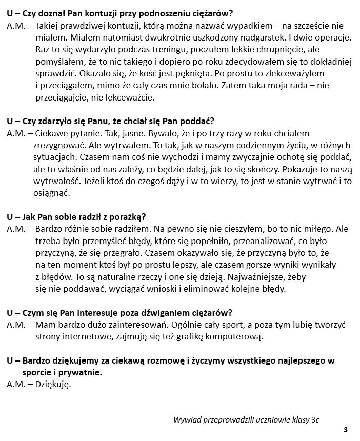 W kwietniu i maju wszystkie klasy 0-3 spotkały się z absolwentem naszej szkoły – Arkadiuszem Michalskim – sztangistą, który jest również naszym polkowickim olimpijczykiem. Pan Arek dwukrotnie brał udział w Igrzyskach Olimpijskich: w Rio de Janeiro i w Tokio. Podczas spotkań, w bardzo ciekawy sposób opowiadał dzieciom, jak długo i ciężko trzeba trenować oraz jakie warunki trzeba spełnić, aby móc wziąć udział w Olimpiadzie. Poruszył ponadto bardzo ważny temat radzenia sobie z przegraną. Dzieci miały okazję poznać technikę podnoszenia ciężarów i mogły spróbować swoich sił "dźwigając" tyczki oraz zmierzyć się w zawodach "brzuszkowych". Podczas jednego ze spotkań nasi trzecioklasiści przeprowadzili z gościem wywiad dotyczący czasów szkolnych w murach naszej „Trójki”. To była bardzo miła podróż w czasie – zarówno dla dzieci, jak i dla Pana Arka. Serdecznie DZIĘKUJEMY za wszystkie wartościowe spotkania, które na długo pozostaną w naszej pamięci!!!