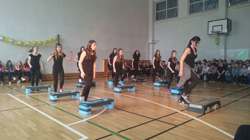 Jako pierwsze wystąpiły dziewczyny z klasy IIIA, IIA, IIE oraz z IB prezentując „Skrzypka”. Potem mogliśmy oglądać dziewczyny z klasy IIB w układzie na stepach. Z kolei parkietem zawładnęły uczennice z IIA tańcząc do piosenki „Waka, waka”. O tym ,że tańczyć mogą nie tylko dziewczyny przekonała nas klasa IIIA wykonując najbardziej popularny w naszej szkole taniec belgijski. Potem przyszła pora na wspólną zabawę przy utworze „Hey baby” . Dynamiczny i żywiołowy rock and roll zaprezentowały uczennice z klasy IA. Z kolei dziewczyny z klasy IIE i IB połączyły swoje siły i oczarowały nas układem do piosenki „Uptown funk”. Zwieńczeniem pokazów była wspólnie odtańczona „Belgija”– ledwo udało się wszystkim pomieścić.